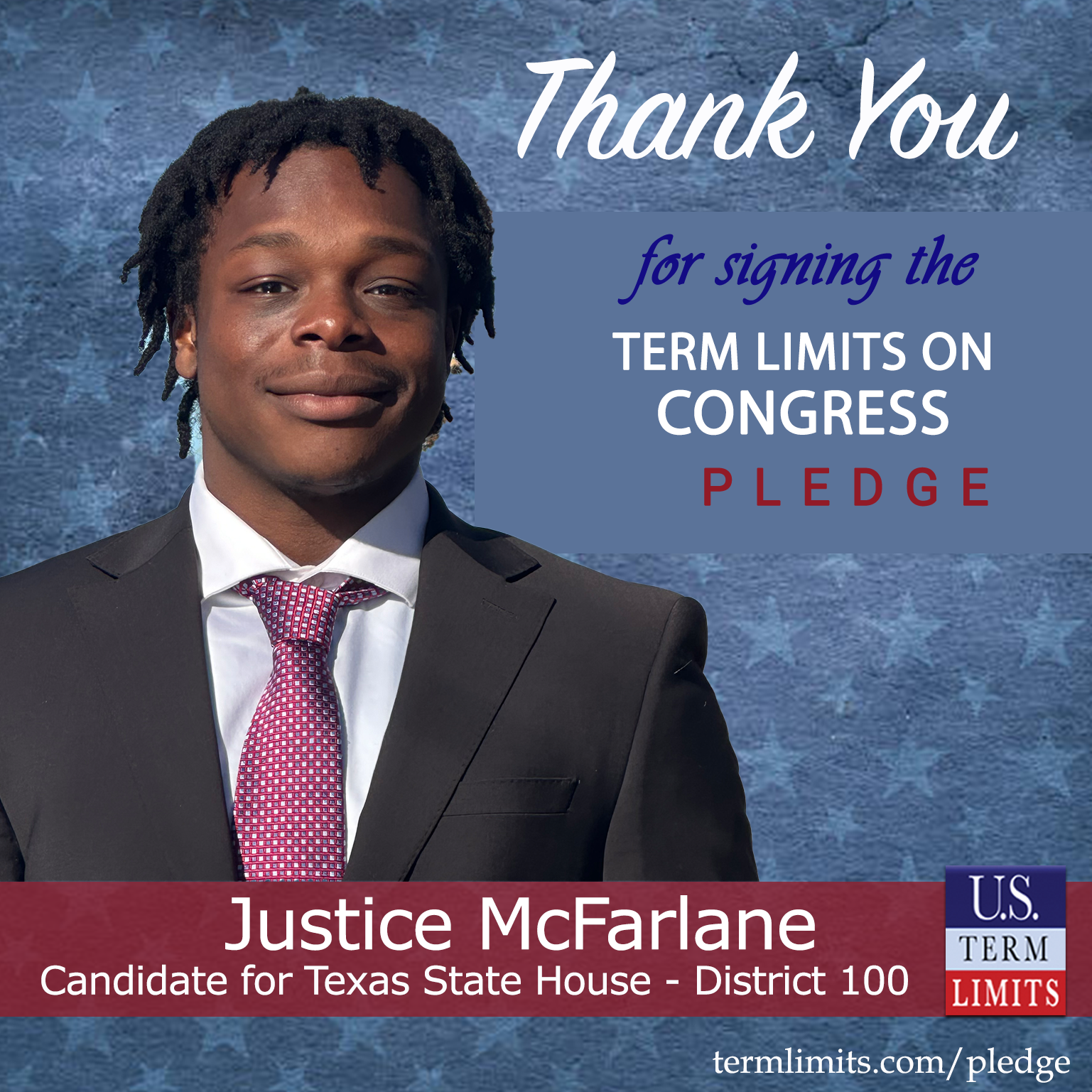 Dallas, TX – U.S. Term Limits (USTL), the leader in the national, non-partisan movement to limit terms for elected officials, is gathering support from state lawmakers across the nation. Its mission is to get 34 states to apply for an amendment proposal convention specific to term limits on Congress. Texas state house candidate, Justice McFarlane (District 100), has committed support for term limits on Congress by signing the term limits convention pledge. McFarlane is the first signer in this race.