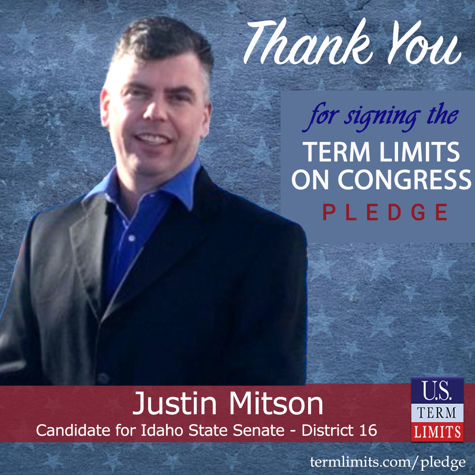 Boise, ID – U.S. Term Limits (USTL), the leader in the national, non-partisan movement to limit terms for elected officials, is gathering support from state lawmakers across the nation. Its mission is to get 34 states to apply for an amendment proposal convention specific to term limits on Congress. Idaho state senate candidate, Justin Mitson (District 16), has committed support for term limits on Congress by signing the Term Limits Convention Pledge.