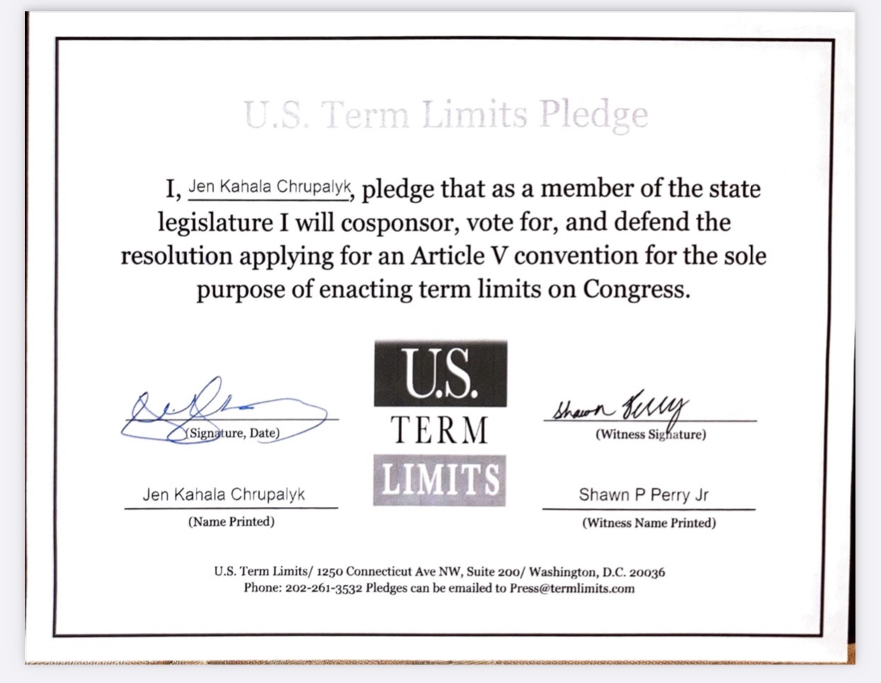 Kahala Chrupalyk Pledges to Support Congressional Term Limits