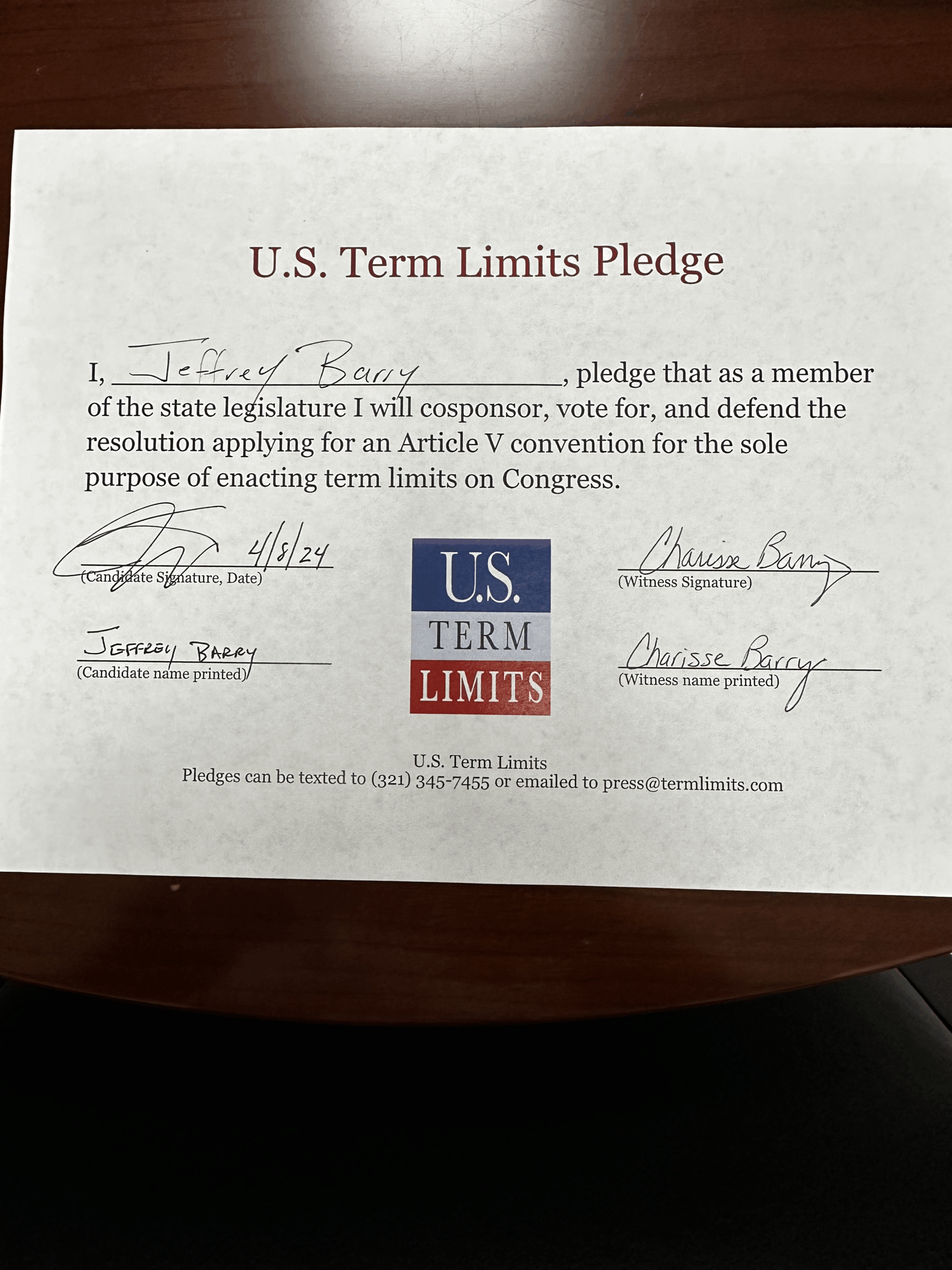The U.S. Term Limits pledge is provided to candidates and members of state legislatures. It reads, “I pledge that, as a member of the state legislature, I will cosponsor, vote for, and defend the resolution applying for an Article V convention for the sole purpose of enacting term limits on Congress.”