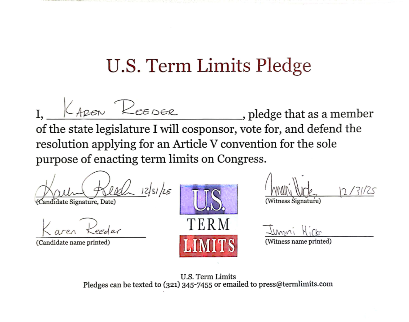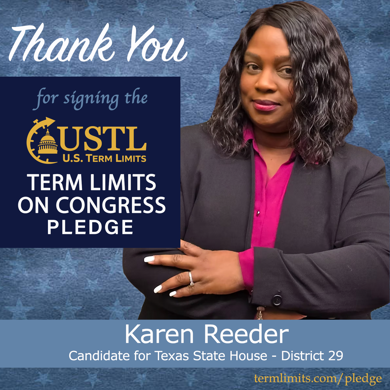 Manvel, TX – U.S. Term Limits (USTL), the leader in the national, non-partisan movement to limit terms for elected officials, is gathering support from state lawmakers across the nation. Its mission is to get 34 states to apply for an amendment proposal convention specific to term limits on Congress. Texas state house candidate, Karen Reeder (district 29), has committed support for term limits on Congress by signing the term limits convention pledge. Previously, incumbent Rep. Jeff Barry also signed the pledge.