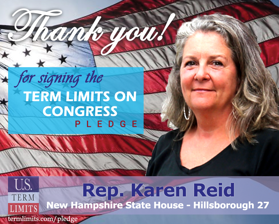 Hillsboro, NH – U.S. Term Limits (USTL), the leader in the national, non-partisan movement to limit terms for elected officials, is gathering support from state lawmakers across the nation. Its mission is to get 34 states to apply for an amendment proposal convention specific to term limits on Congress. New Hampshire state Rep. Karen Reid (Hillsborough 27), has committed support for term limits on Congress by signing the Term Limits Convention pledge.