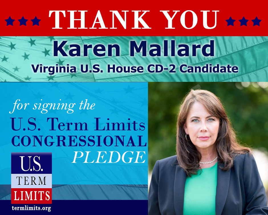 Washington, D.C. – U.S. Term Limits (USTL), the leader in the national movement to limit terms for elected officials, today praised Virginia candidate for U.S. House CD-2, Karen Mallard, for signing its congressional term limits pledge. Karen is the first candidate in this race to commit her support to proposing term limits on Congress.