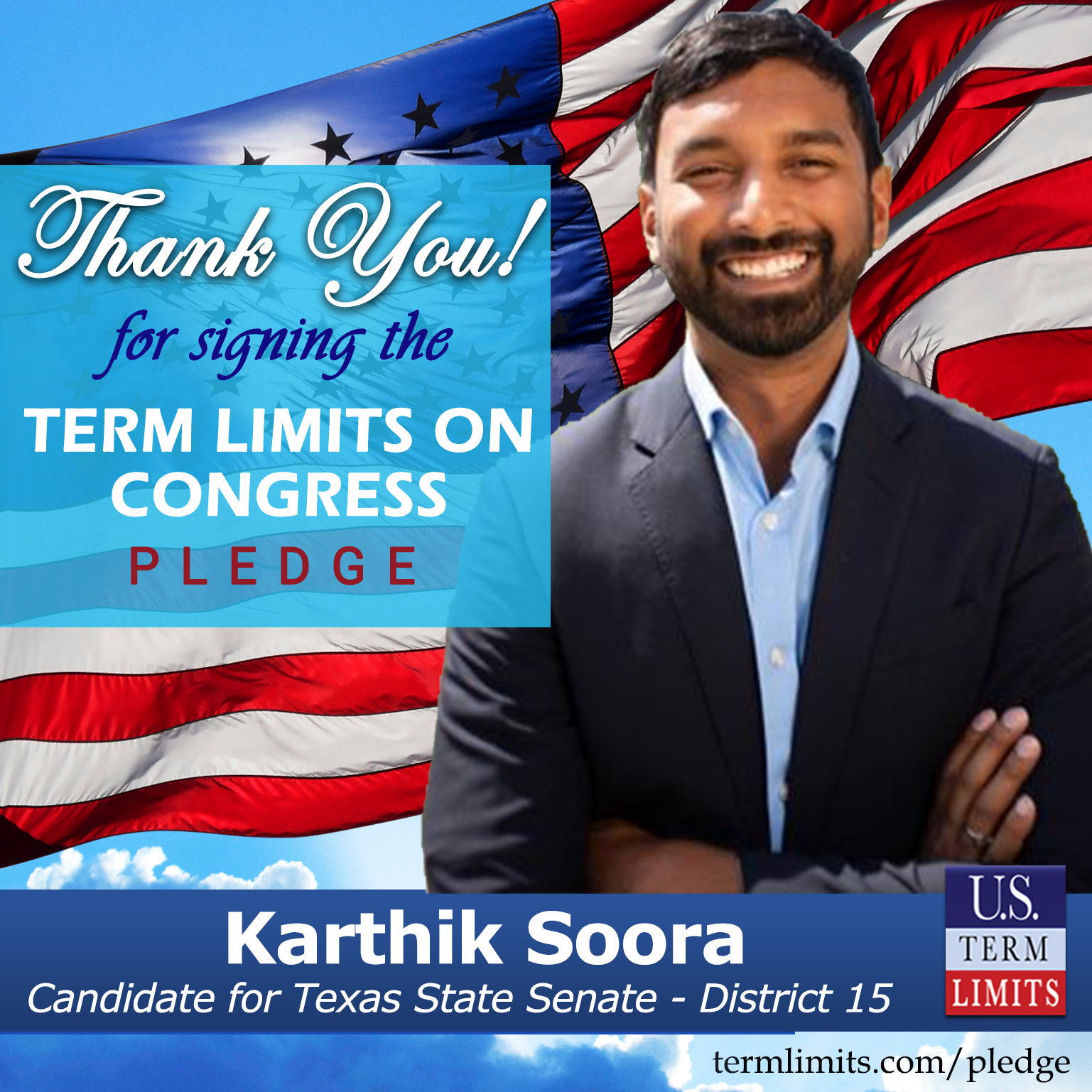 Houston, TX – U.S. Term Limits (USTL), the leader in the national, non-partisan movement to limit terms for elected officials, is gathering support from state lawmakers across the nation. Its mission is to get 34 states to apply for an amendment proposal convention specific to term limits on Congress. Texas state senate candidate, Karthik Soora (District 15), has committed support for term limits on Congress by signing the term limits convention pledge. Soora is the first signer in this race.