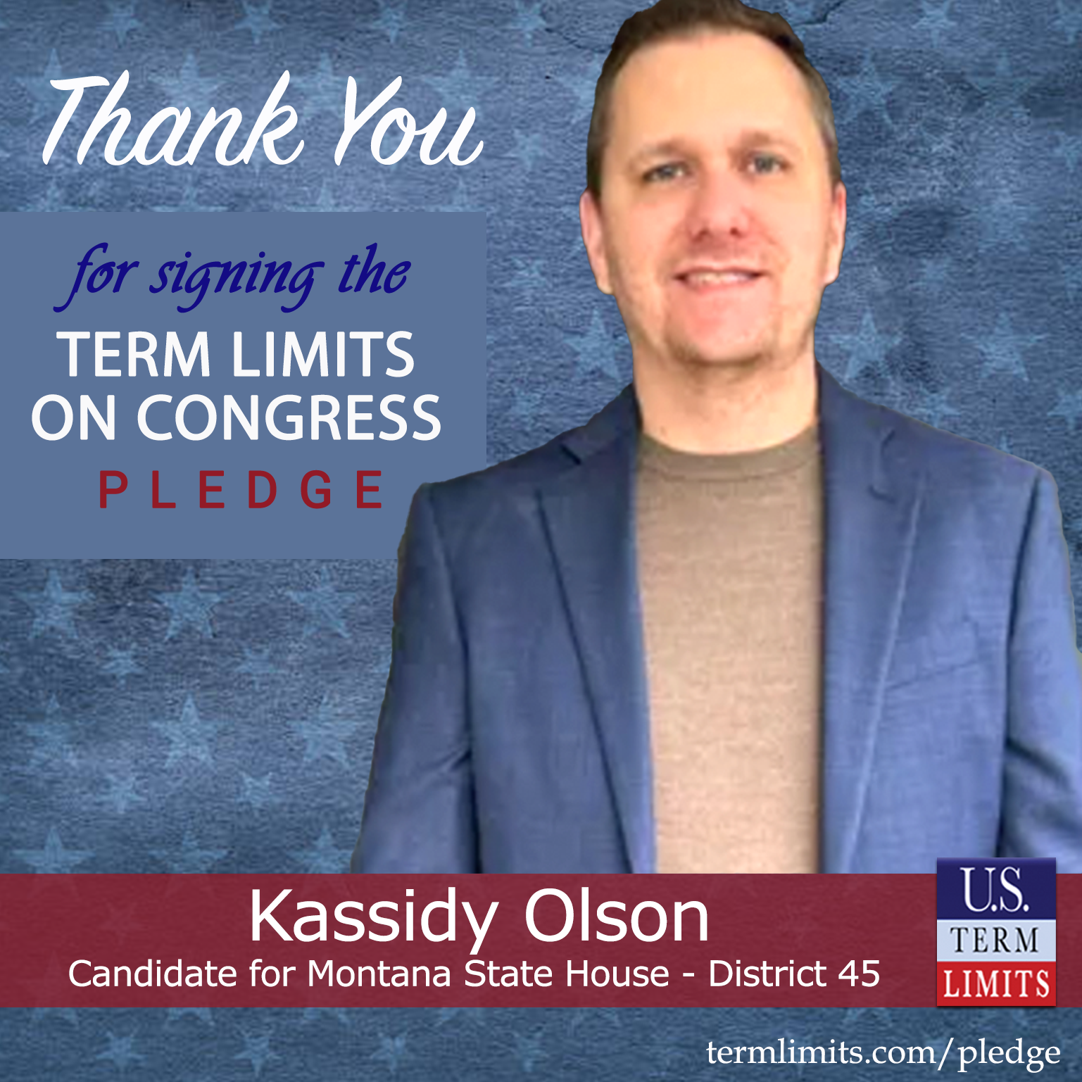 Montana’s state chair for U.S. Term Limits, Ed Walker, commented on Olson’s pledge saying, “Term limits is critical for the future of our country. I am glad Kassidy has signed the pledge in supporting term limits on Congress. It shows that he understands the importance of the vision of our founding fathers and fixing DC. “