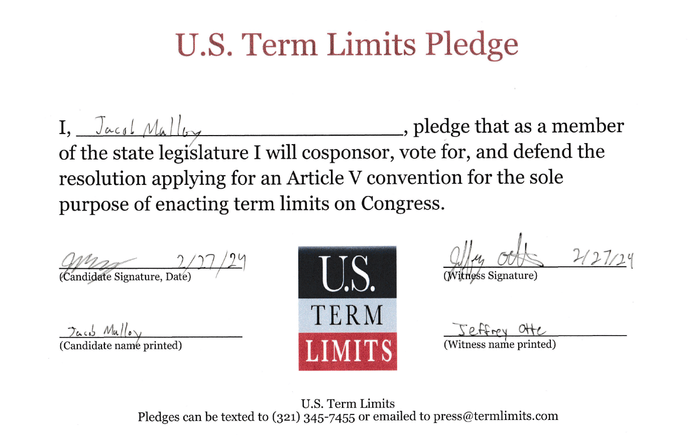 The U.S. Term Limits pledge is provided to candidates and members of state legislatures. It reads, “I pledge that, as a member of the state legislature, I will cosponsor, vote for, and defend the resolution applying for an Article V convention for the limited purpose of enacting term limits on Congress.”