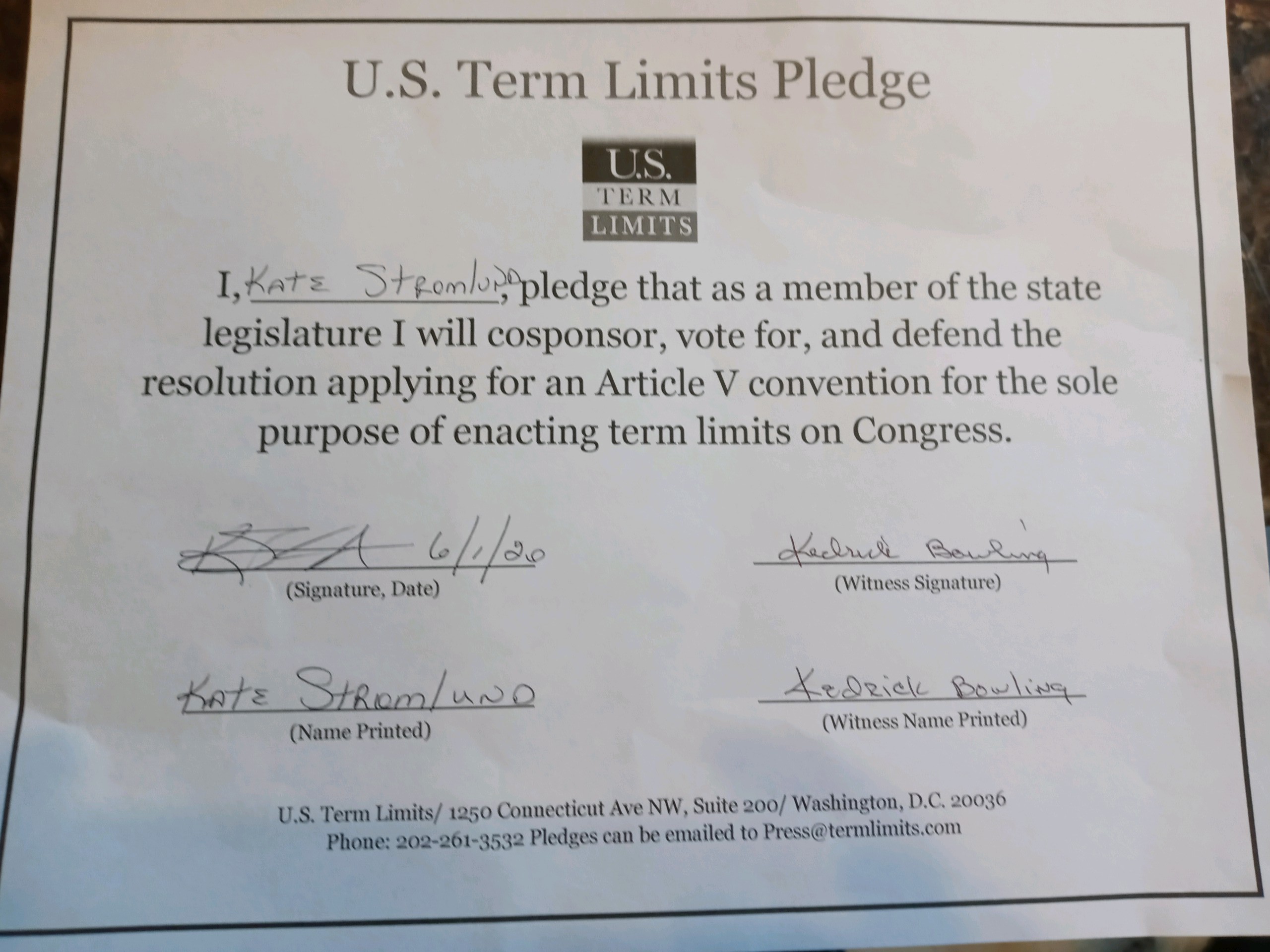 Kate Stromlund Pledges to Support Congressional Term Limits