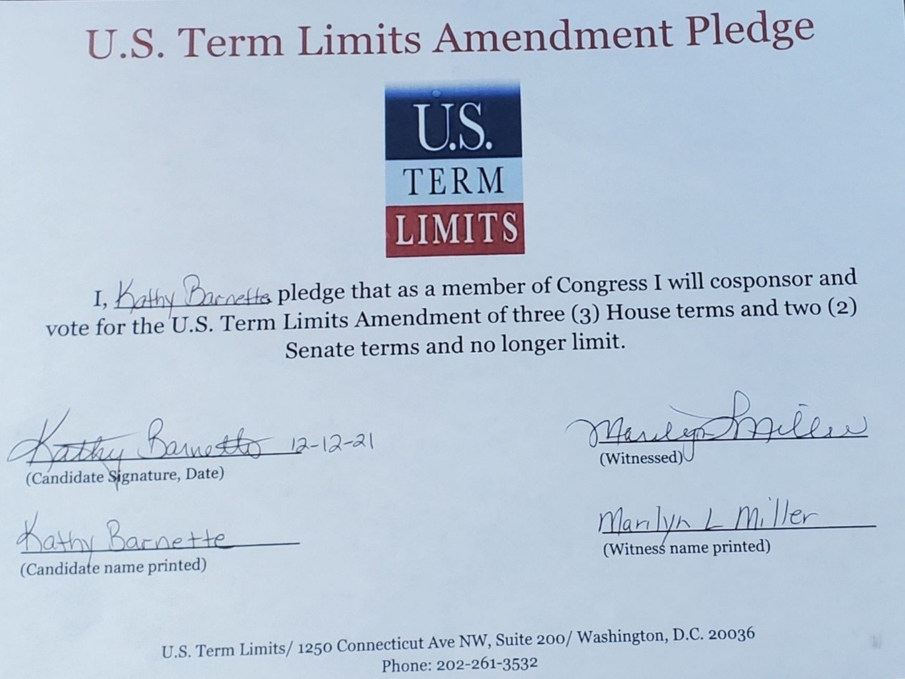 Washington D.C. – U.S. Term Limits (USTL), the leader in the non-partisan national movement to limit terms for elected officials, praises 2022 U.S. Senate candidate for Pennsylvania, Kathy Barnette, for signing the pledge for an amendment to term limit Congress. Previously, candidates Mehmet Oz, Sean Parnell, Martin Rosenfeld, Carla Sands, Alexandria Khalil, Sean Gale, Kevin Baumlin, John DeBellis, Jeff Bartos and Larry E. Johnson also signed the pledge.