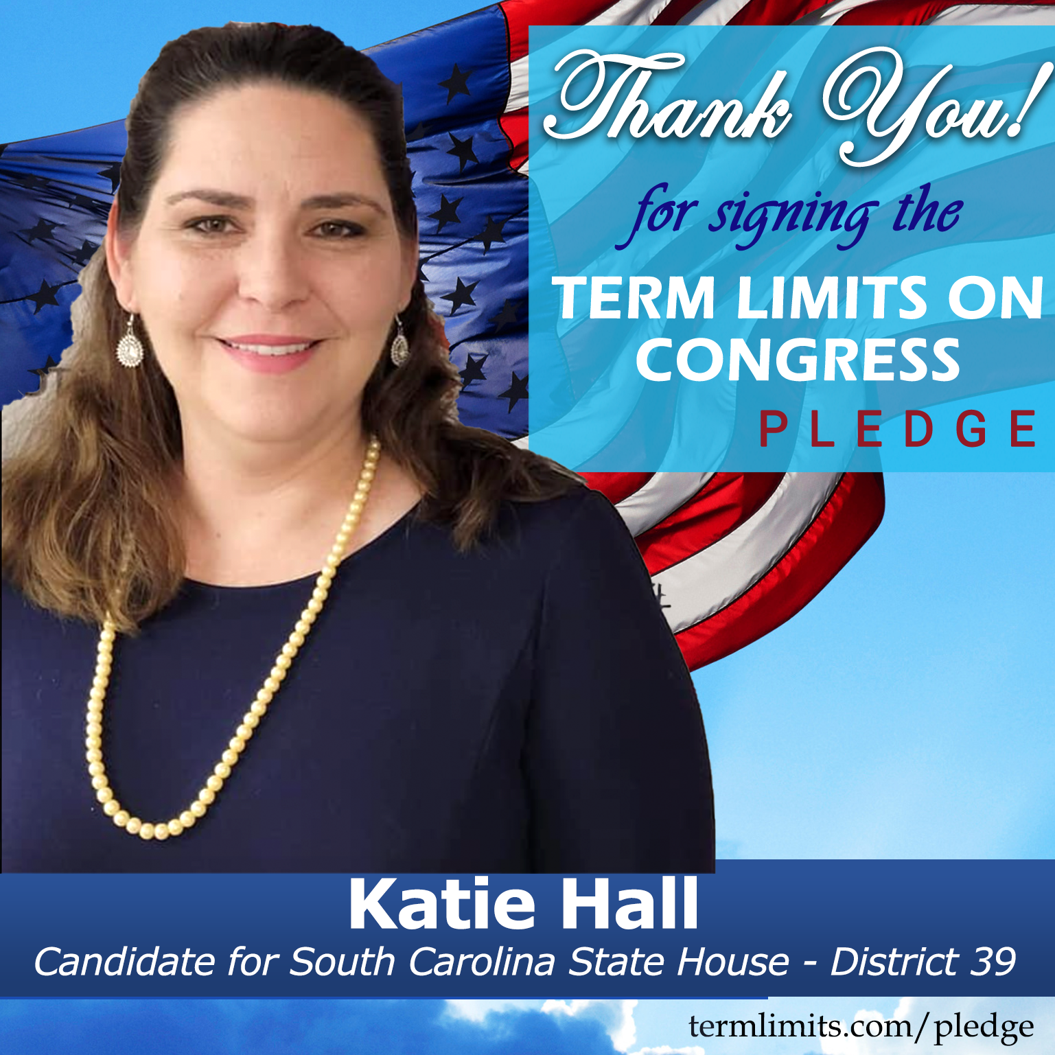 Leesville, SC – U.S. Term Limits (USTL), the leader in the national, non-partisan movement to limit terms for elected officials, is gathering support from state lawmakers across the nation. Its mission is to get 34 states to apply for an amendment proposal convention specific to term limits on Congress. South Carolina state house candidate, Katie Hall (District 39), has committed support for term limits on Congress by signing the Term Limits Convention Pledge.