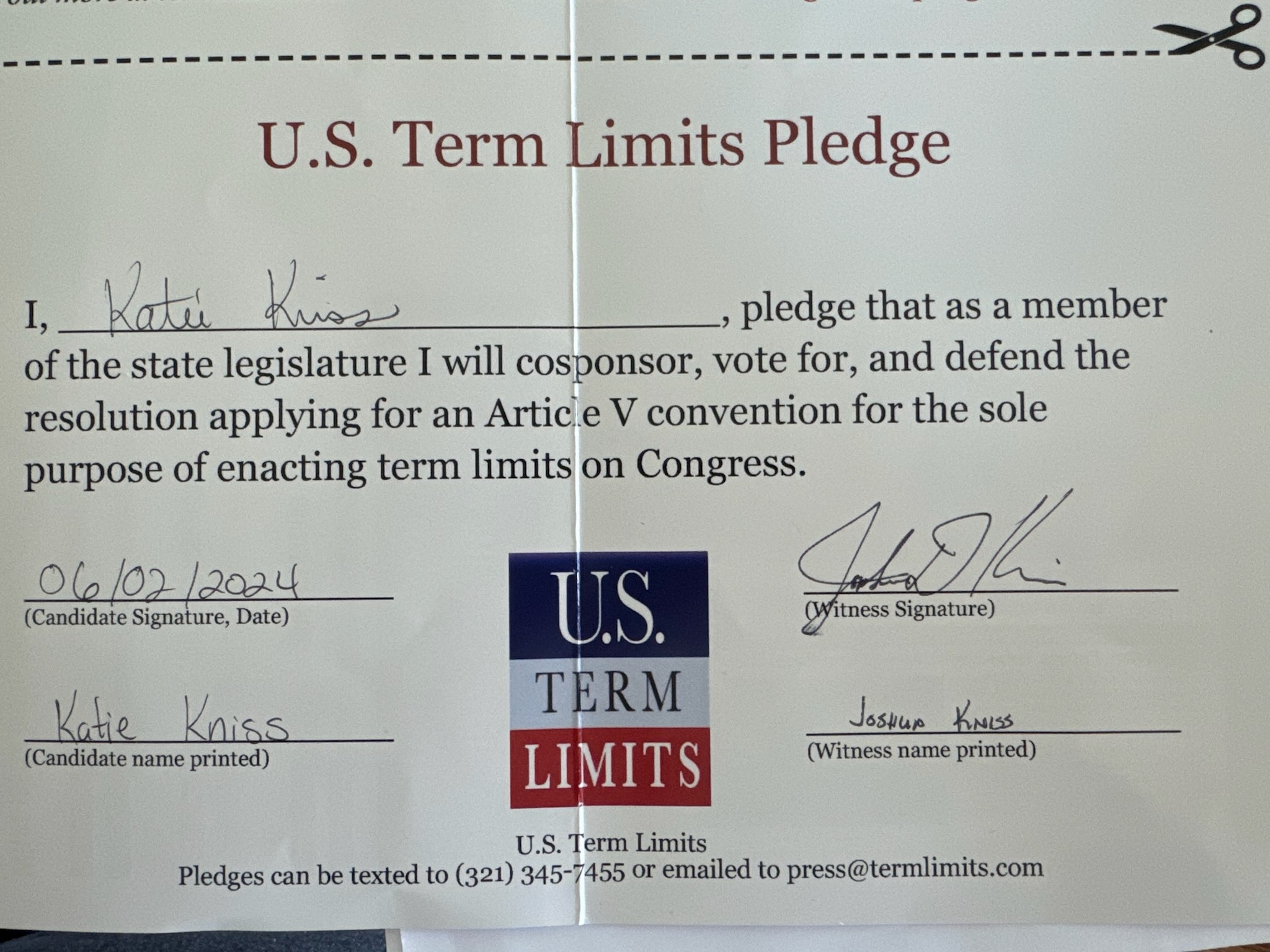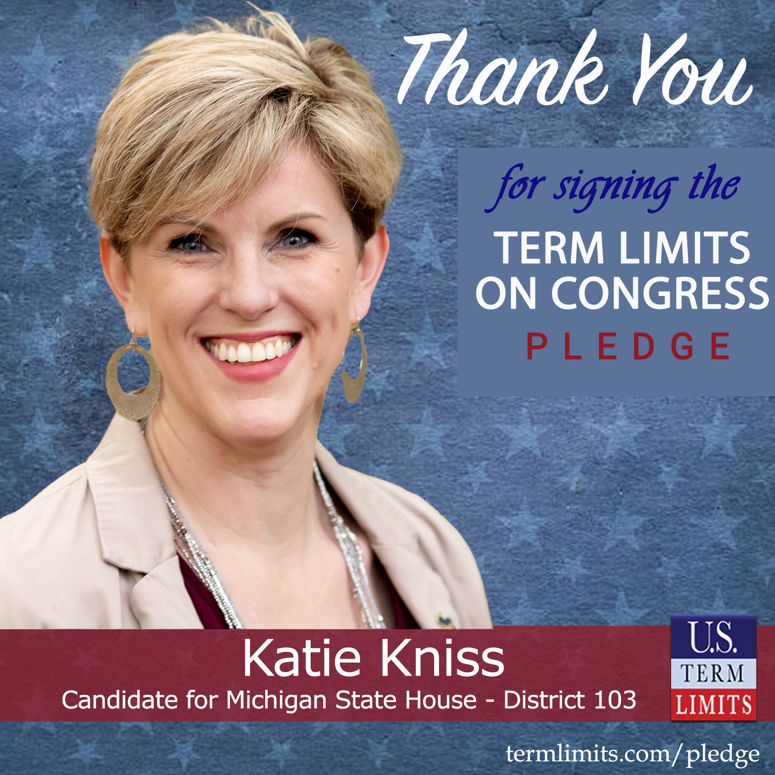 USTL President, Philip Blumel, commented on Kniss’s pledge saying, “Katie’s strong support of term limits shows that there are individuals who are willing to listen to the majority of voters who want term limits. America needs a Congress that will be served by citizen legislators, not career politicians.”