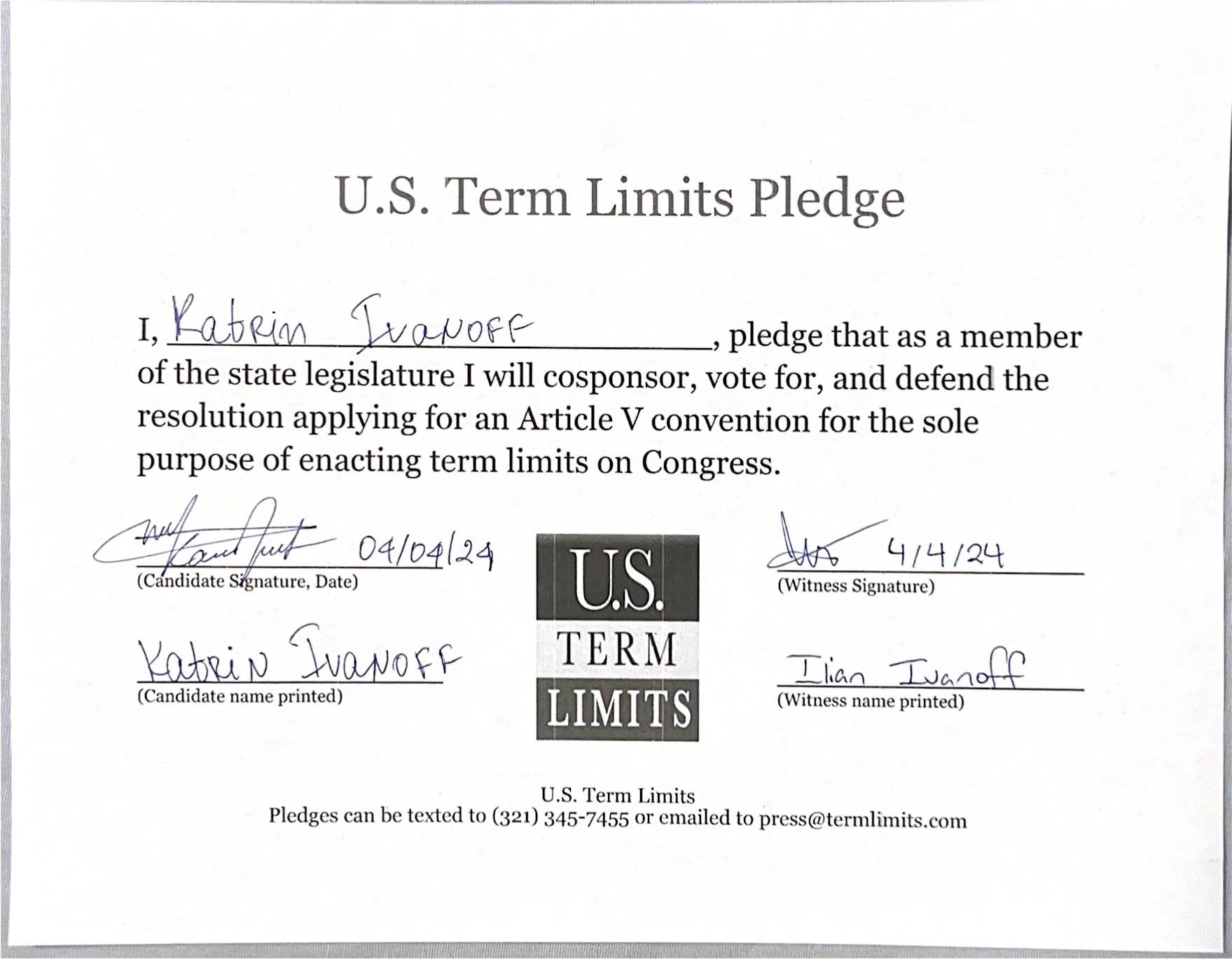 Katrin Ivanoff Pledges to Support Congressional Term Limits