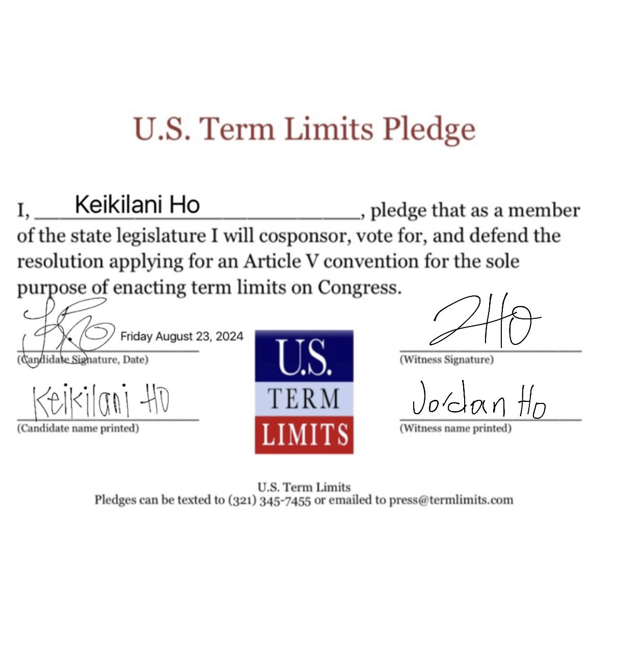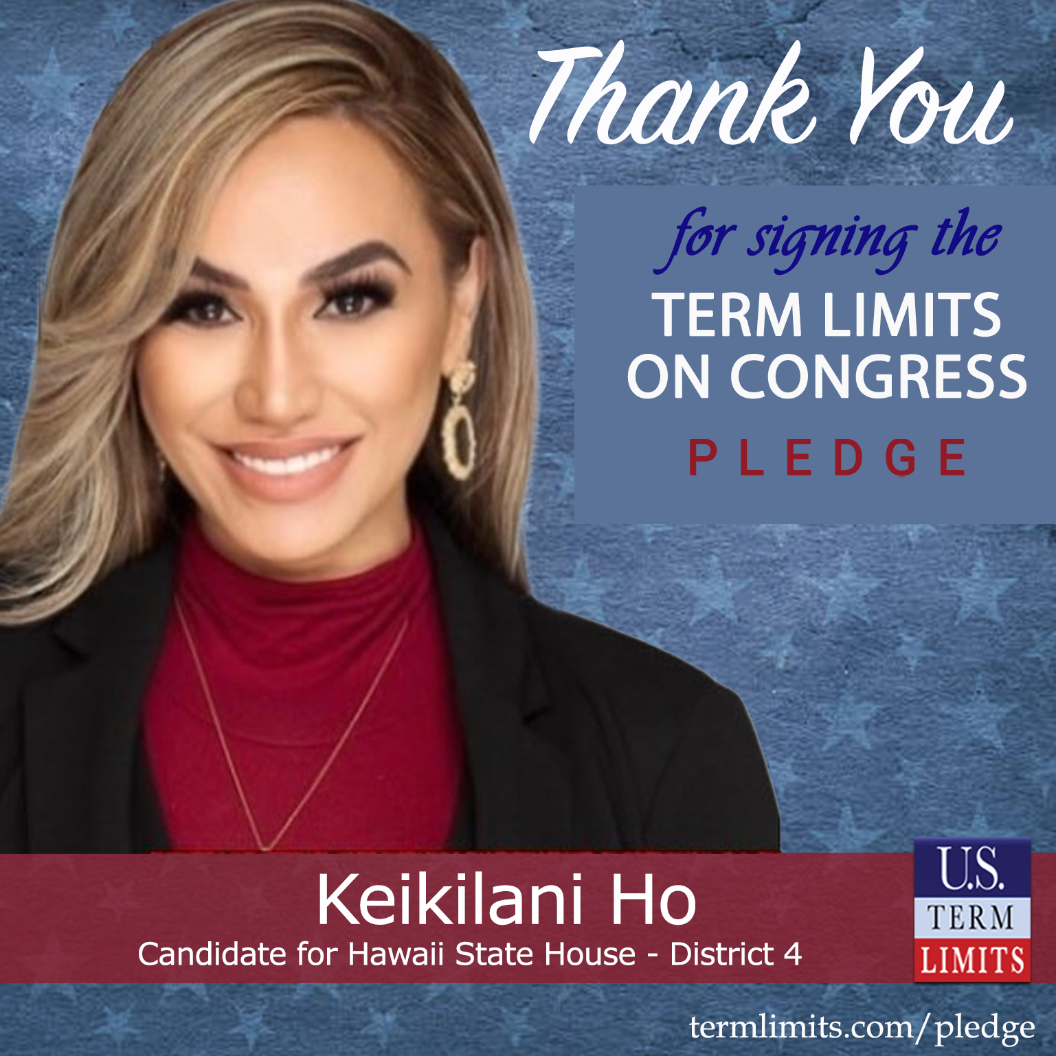 USTL President, Philip Blumel, commented on Ho’s pledge saying, “Keikilani’s strong support of term limits shows that there are individuals who are willing to listen to the majority of voters who want term limits. America needs a Congress that will be served by citizen legislators, not career politicians.”