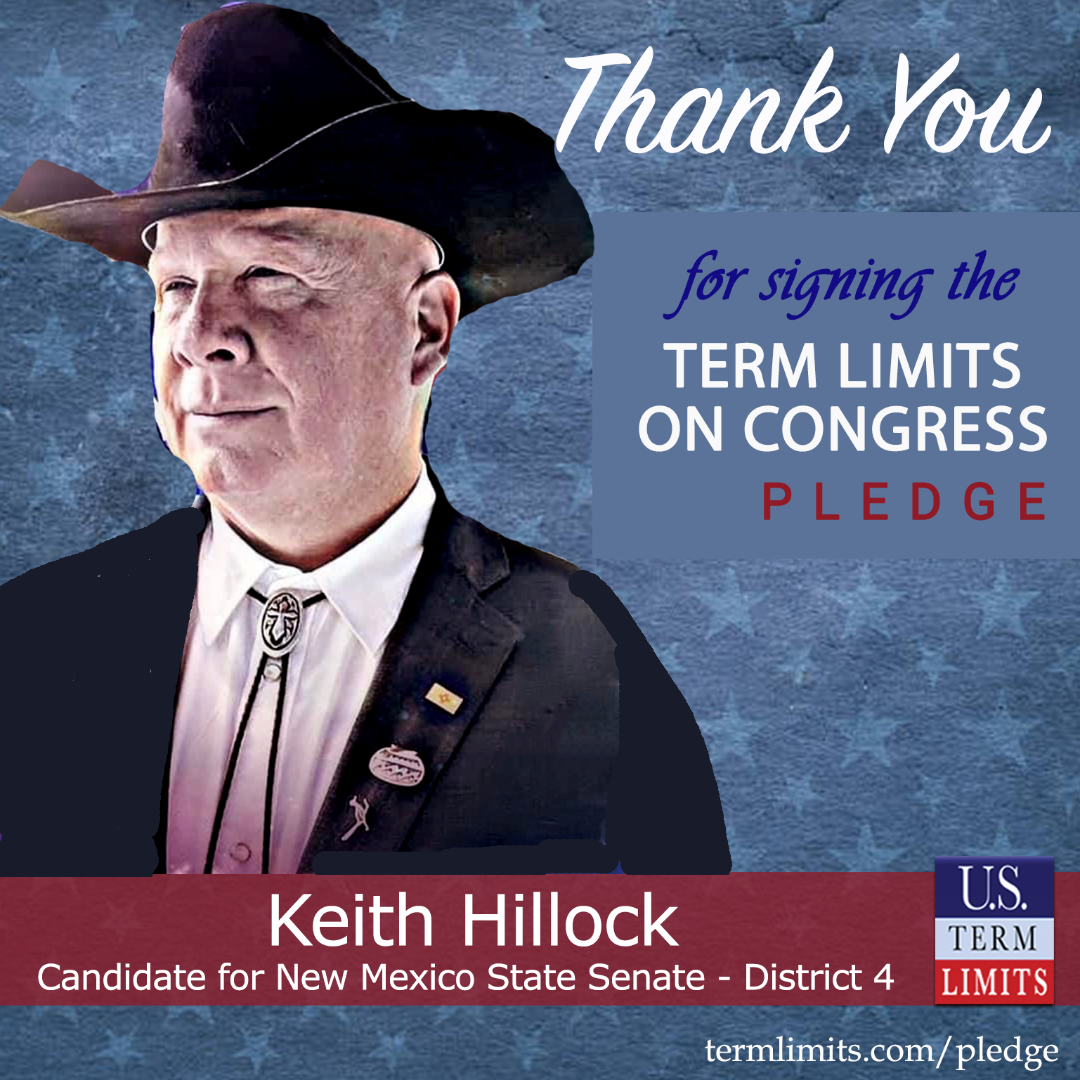 Gallup, NM– U.S. Term Limits (USTL), the leader in the national, non-partisan movement to limit terms for elected officials, is gathering support from state lawmakers across the nation. Its mission is to get 34 states to apply for an amendment proposal convention specific to term limits on Congress. New Mexico state senate candidate, Keith Hillock (District 4), has committed support for term limits on Congress by signing the term limits convention pledge. Hillock is the first signer in this race.