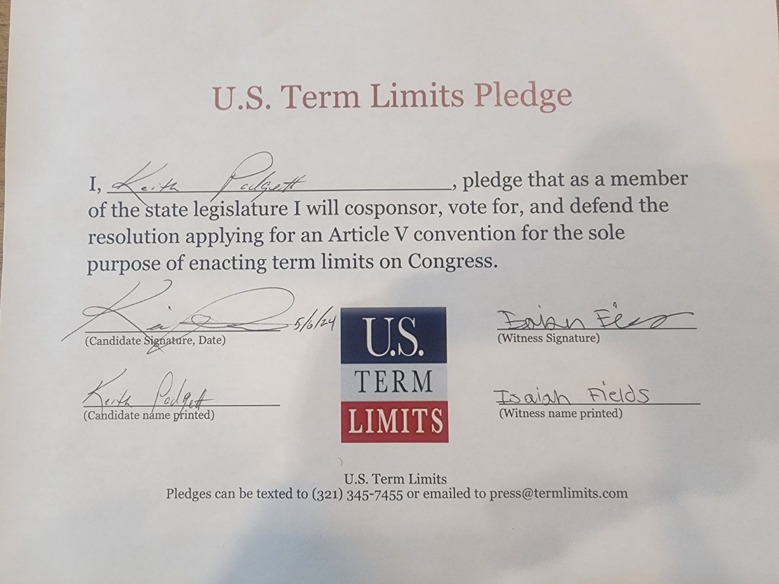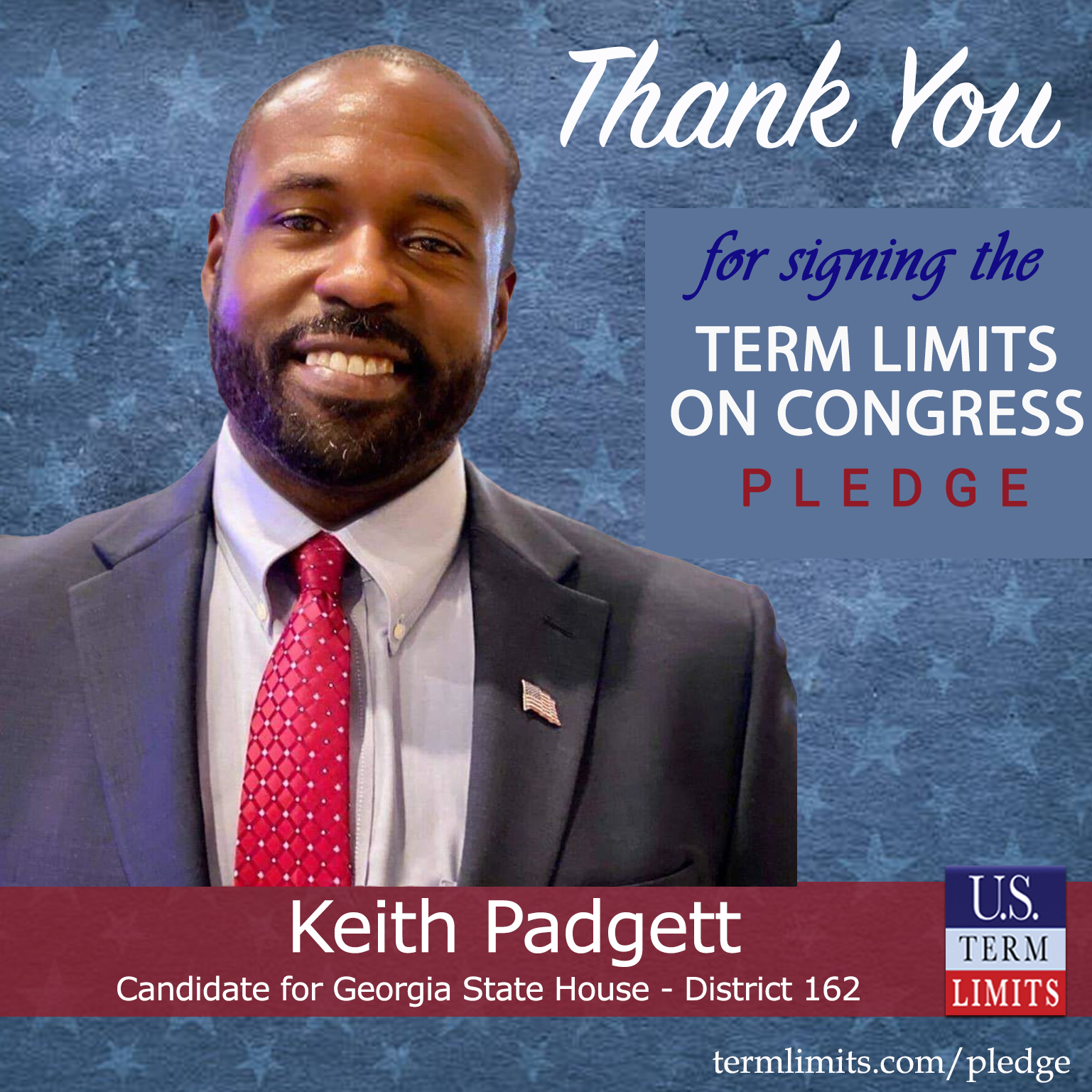 Garden City, GA – U.S. Term Limits (USTL), the leader in the national, non-partisan movement to limit terms for elected officials, is gathering support from state lawmakers across the nation. Its mission is to get 34 states to apply for an amendment proposal convention specific to term limits on Congress. Georgia state house candidate, Keith Padgett (District 162), has committed support for term limits on Congress by signing the term limits convention pledge. Previously, Rep. Carl Gilliard also signed the pledge.