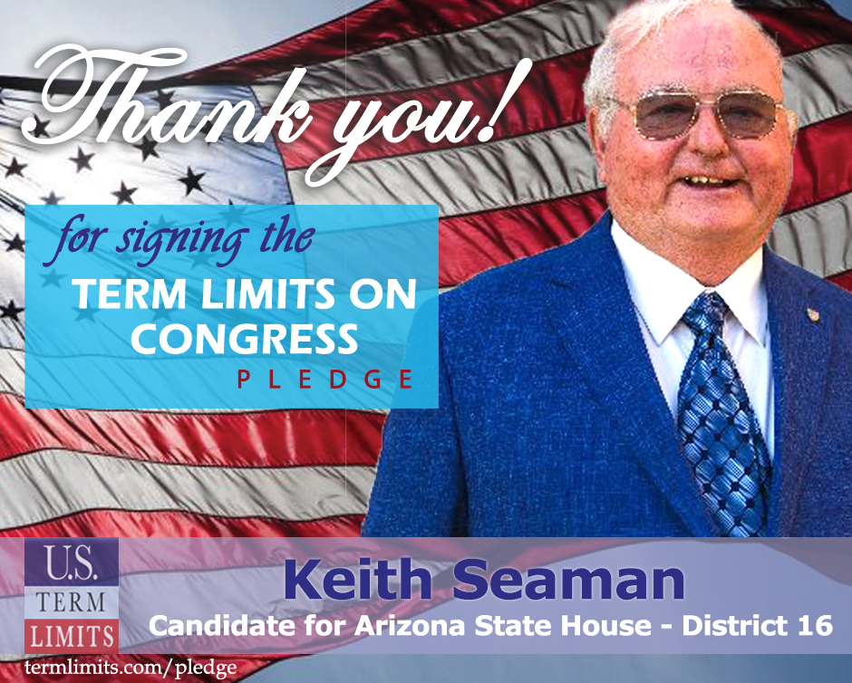 Maricopa, AZ – U.S. Term Limits (USTL), the leader in the national, non-partisan movement to limit terms for elected officials, is gathering support from state lawmakers across the nation. Its mission is to get 34 states to apply for an amendment proposal convention specific to term limits on Congress. Arizona state house candidate, Keith Seaman (district 16) has committed support for term limits on Congress by signing the Term Limits Convention pledge. Previously, candidate Rob Hudelson also signed the pledge.