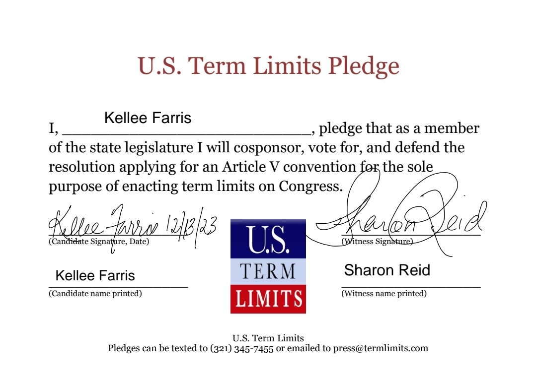 USTL President, Philip Blumel, commented on Farris’s pledge saying, “Kellee’s strong support of term limits shows that there are individuals who are willing to listen to the majority of voters who want term limits. America needs a Congress that will be served by citizen legislators, not career politicians.”