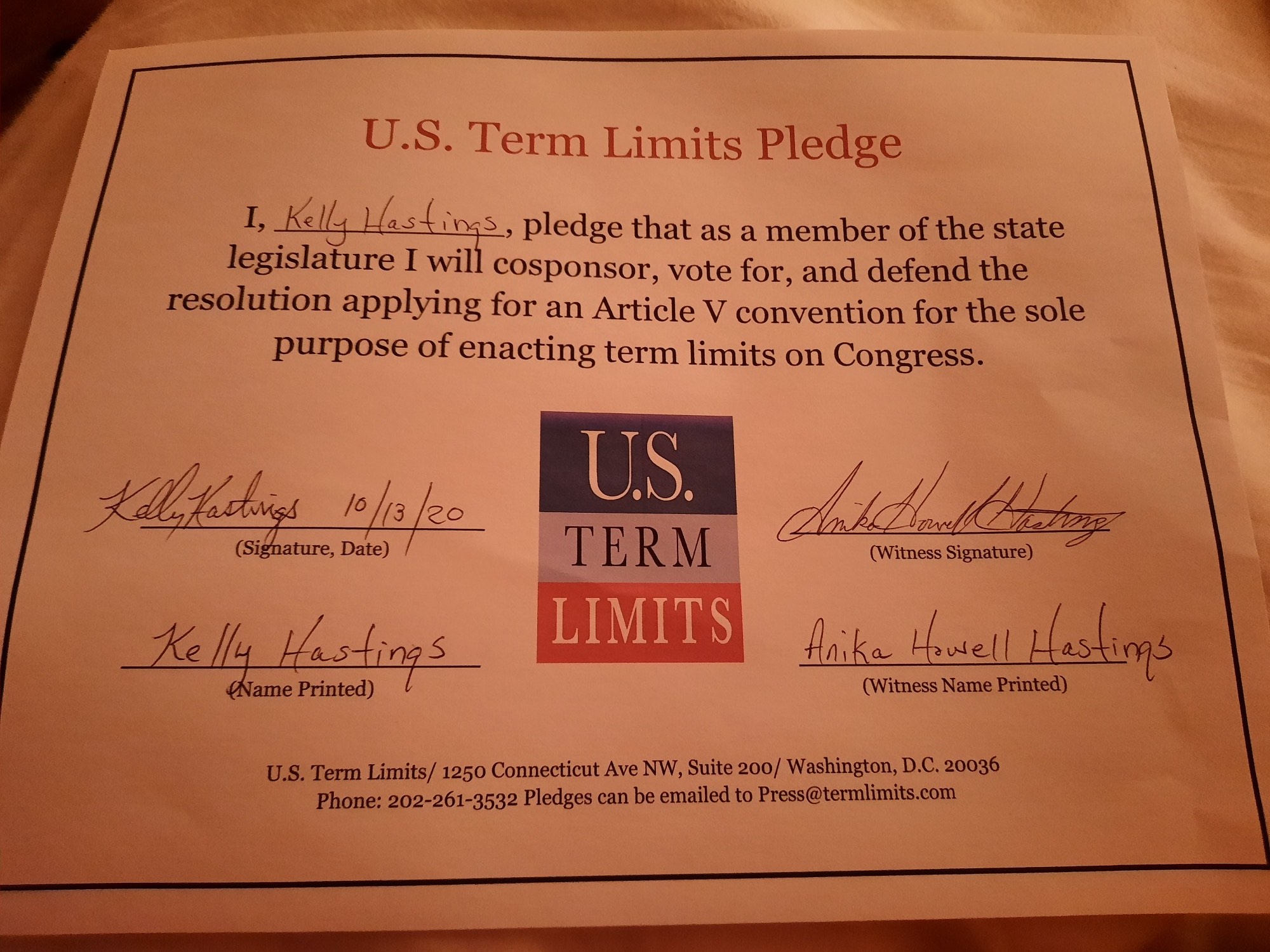 Rep. Kelly Hastings Pledges to Support Congressional Term Limits