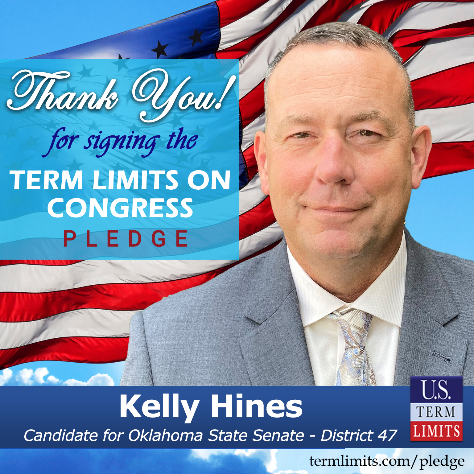Edmond, OK – U.S. Term Limits (USTL), the leader in the national, non-partisan movement to limit terms for elected officials, is gathering support from state lawmakers across the nation. Its mission is to get 34 states to apply for an amendment proposal convention specific to term limits on Congress. Oklahoma state senate candidate, Kelly Hines (District 47), has committed support for term limits on Congress by signing the term limits convention pledge.