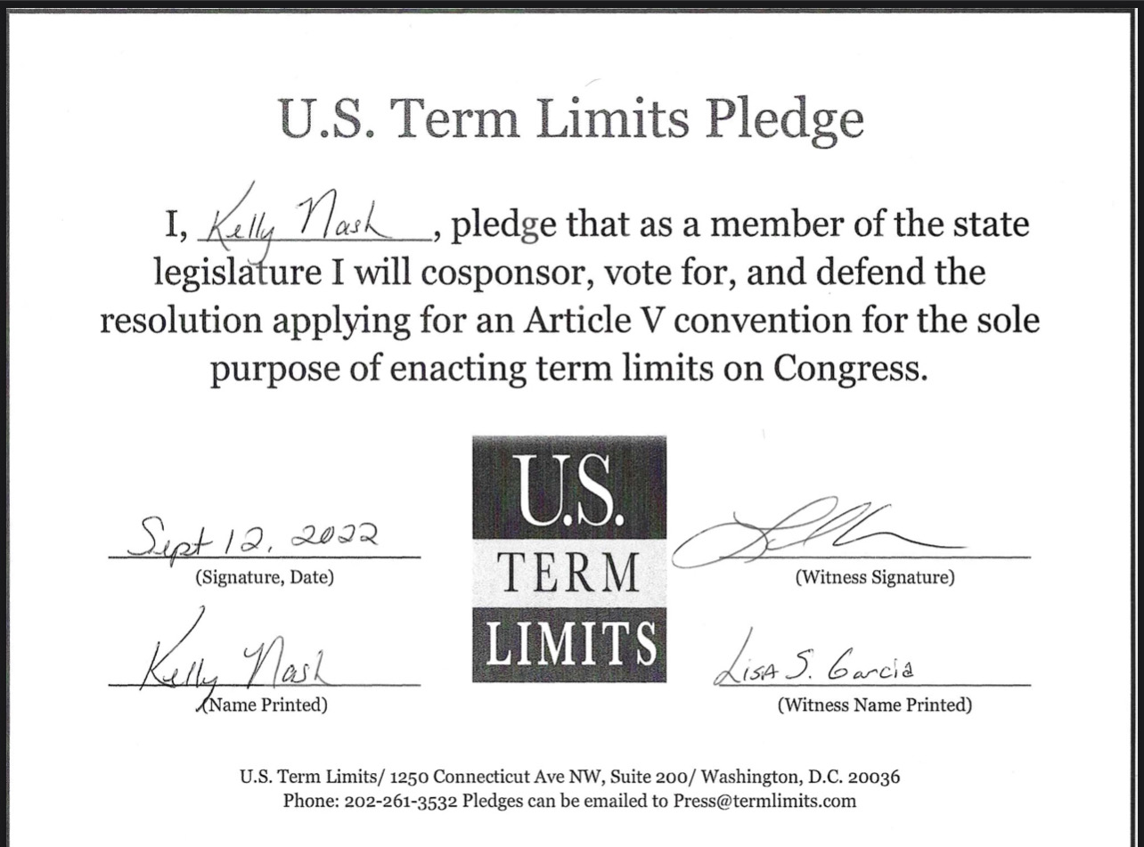 Fairbanks, AK – U.S. Term Limits (USTL), the leader in the national, non-partisan movement to limit terms for elected officials, is gathering support from state lawmakers across the nation. Its mission is to get 34 states to apply for an amendment proposal convention specific to term limits on Congress. Alaska state house candidate, Kelly Nash (district 31), has committed support for term limits on Congress by signing the Term Limits Convention pledge.