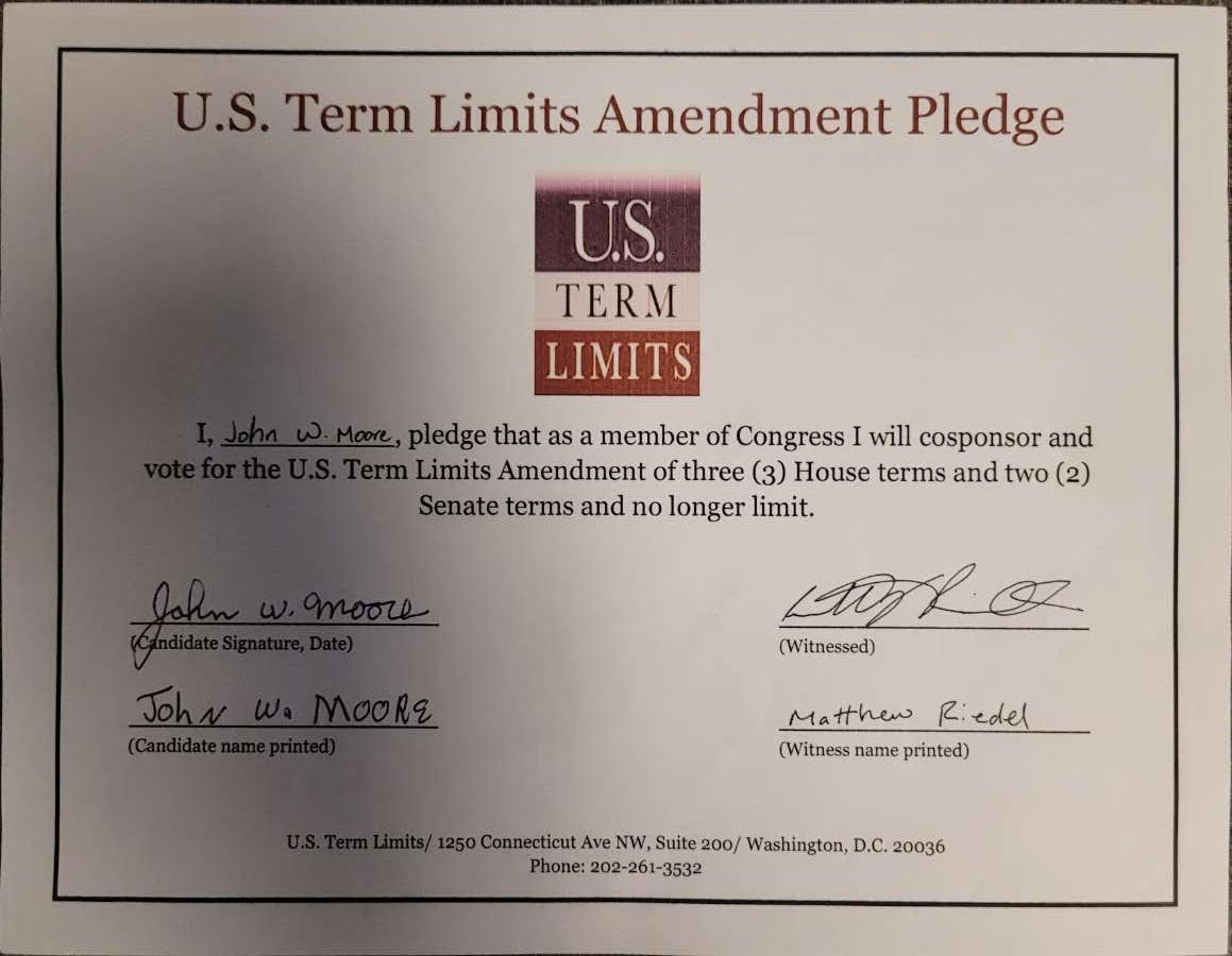 The U.S. Term Limits amendment pledge is provided to every announced candidate for federal office. It reads, “I pledge that as a member of Congress, I will cosponsor and vote for the U.S. Term Limits amendment of three (3) House terms and two (2) Senate terms and no longer limit.” The U.S. Term Limits constitutional amendment has been introduced in both the U.S. Senate by Senator Ted Cruz and his colleagues (SJR3) and the U.S. House by Representative Ralph Norman (HJR12).