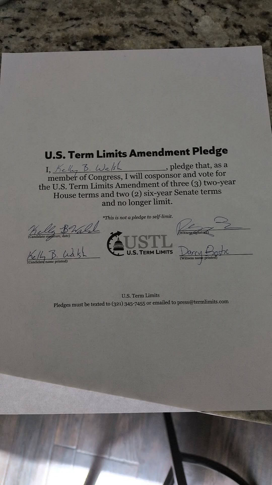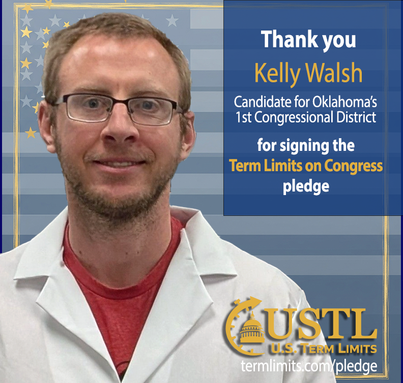 Washington D.C. – U.S. Term Limits (USTL), the leader in the non-partisan national movement to limit terms for elected officials, praises 2026 U.S. Representative candidate for Oklahoma,Kelly Walsh (district 1), for signing the pledge for an amendment to term limit Congress. Previously, candidates Jed Cochran, Nancy Dyson, Kim David, John Croisant, Mark Tedford and Jackson Lahmeyer also signed.