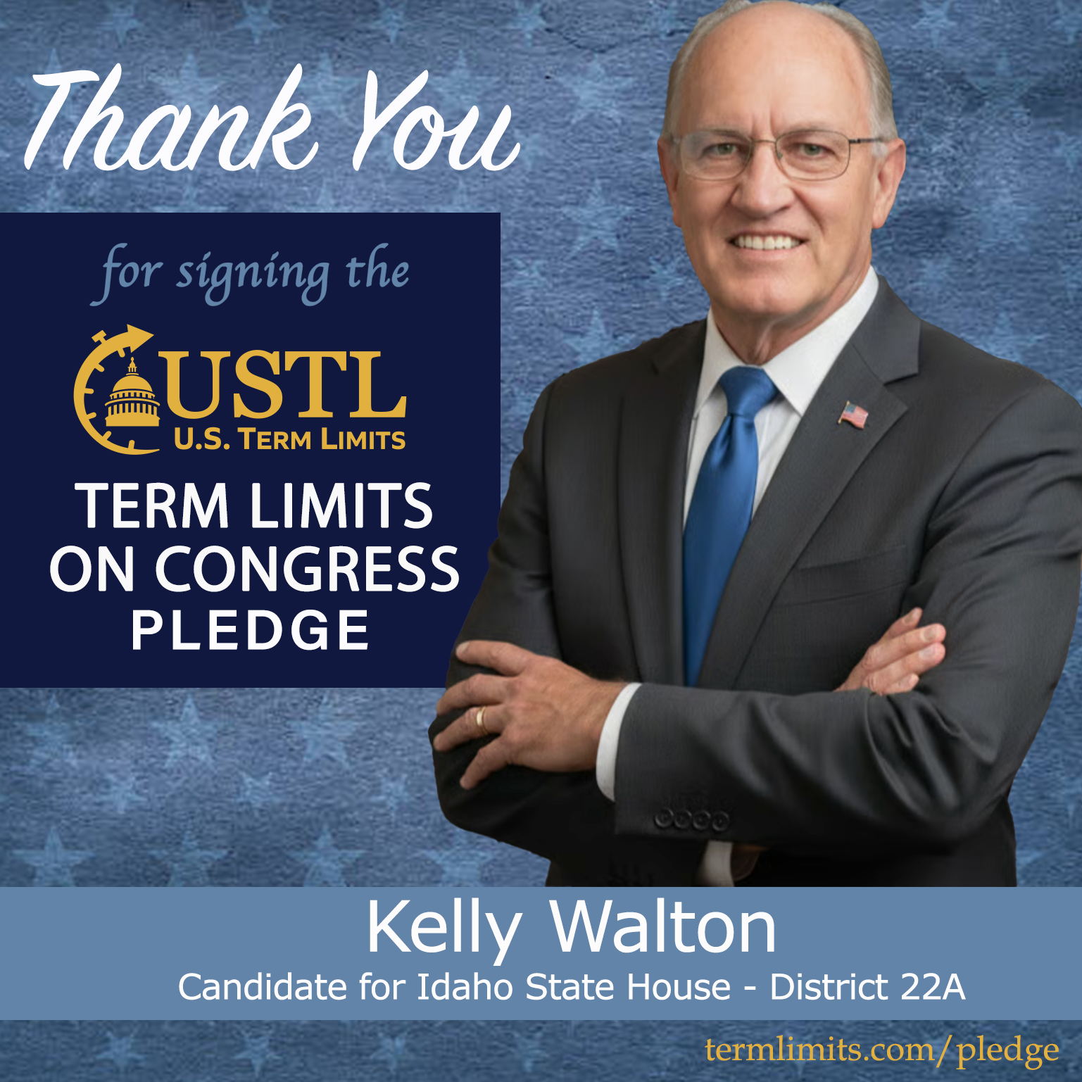 Kuna, ID – U.S. Term Limits (USTL), the leader in the national, non-partisan movement to limit terms for elected officials, is gathering support from state lawmakers across the nation. Its mission is to get 34 states to apply for an amendment proposal convention specific to term limits on Congress. 2026 Idaho state house candidate, Kelly Walton (district 22A), has committed support for term limits on Congress by signing the term limits convention pledge. Previously, candidate Greg Ferch also signed the pledge.