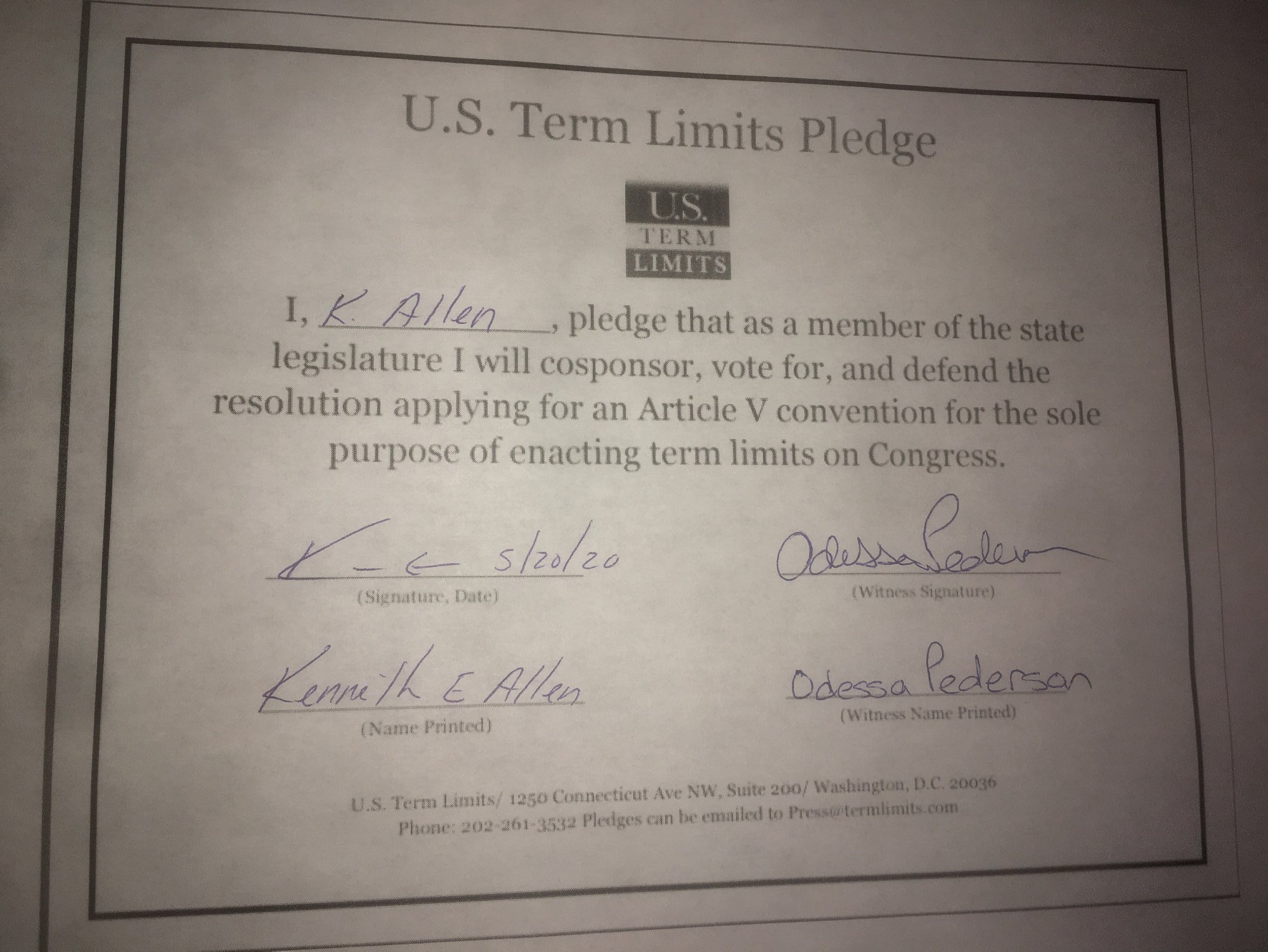 Kenneth Allen Pledges to Support Congressional Term Limits