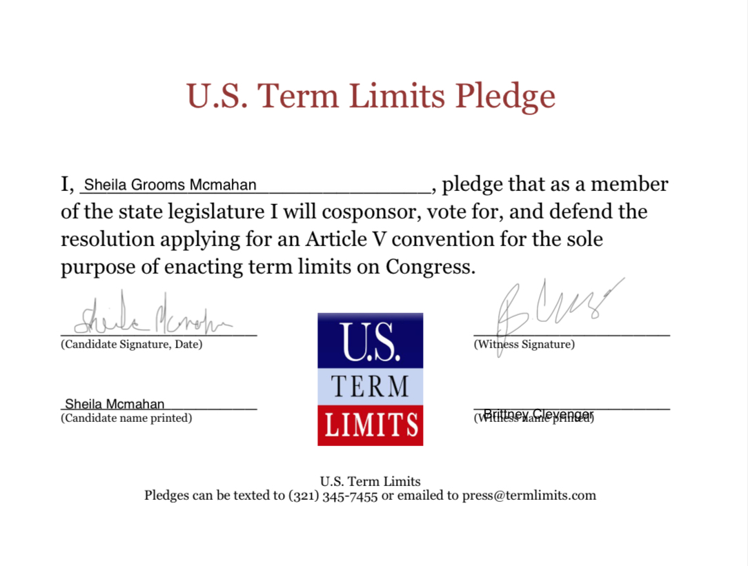 The U.S. Term Limits pledge is provided to candidates and members of state legislatures. It reads, “I pledge that, as a member of the state legislature, I will cosponsor, vote for, and defend the resolution applying for an Article V convention for the sole purpose of enacting term limits on Congress.”