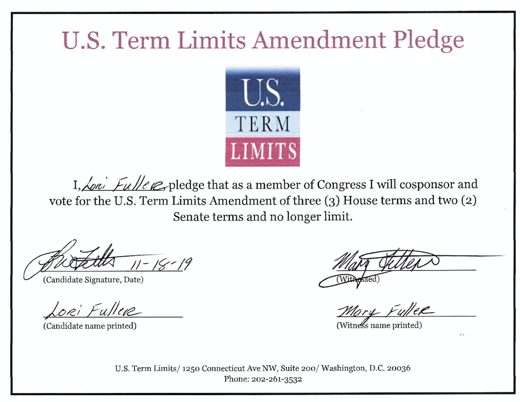 The U.S. Term Limits amendment pledge is provided to every announced candidate for federal office. It reads, “I pledge that as a member of Congress, I will cosponsor and vote for the U.S. Term Limits amendment of three (3) House terms and two (2) Senate terms and no longer limit.” The U.S. Term Limits constitutional amendment has been introduced in both the U.S. Senate by Senator Ted Cruz (SJR1) and the U.S. House by Representative Francis Rooney (HJR20).