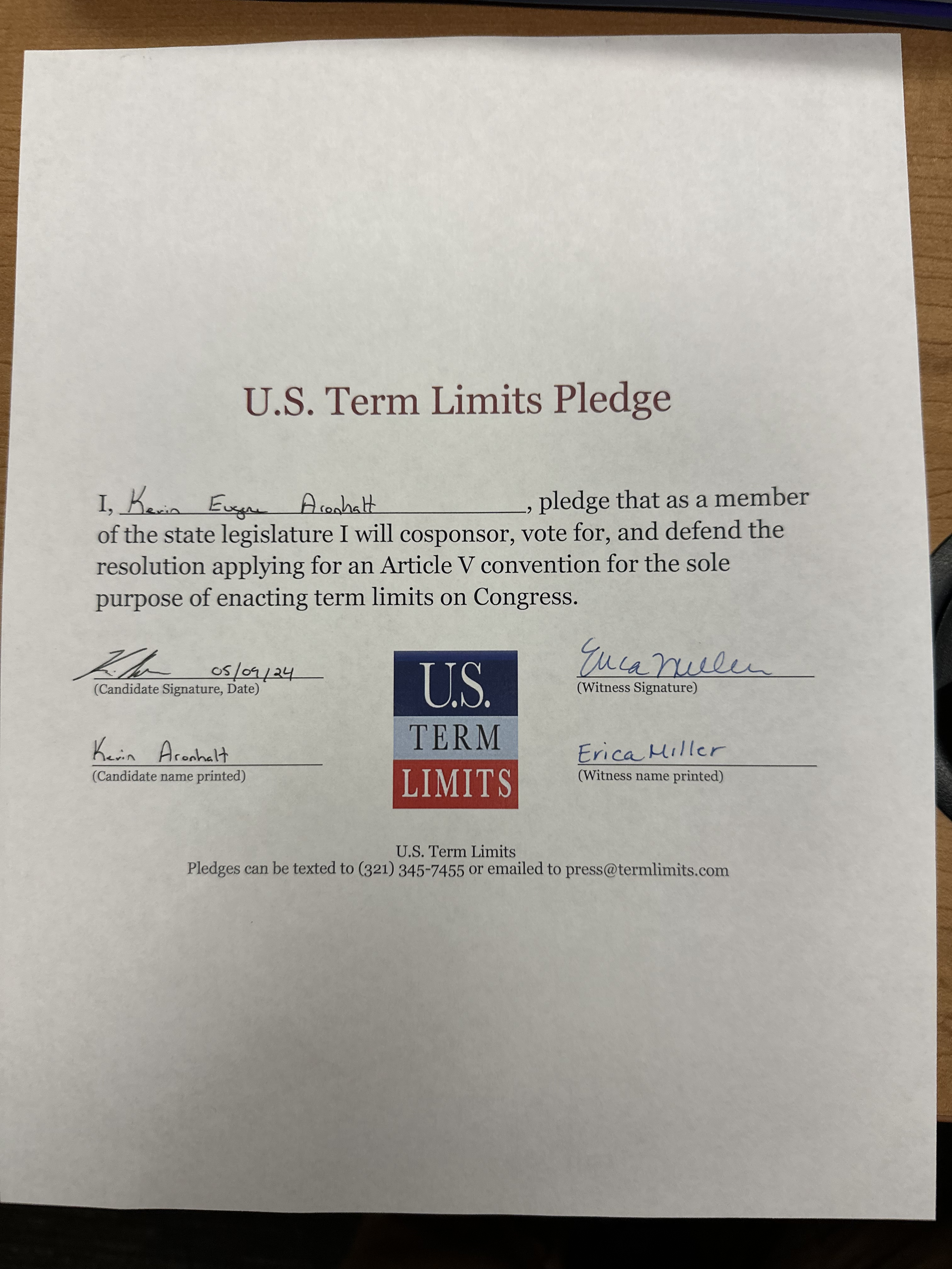 Kevin Aronhalt Pledges to Support Congressional Term Limits