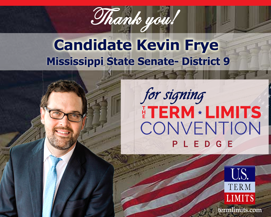 Washington, D.C. – U.S. Term Limits (USTL), the leader in the national, non-partisan movement to limit terms for elected officials, is gathering support from state lawmakers across the nation. Its mission is to get 34 states to apply for an amendment proposal convention specific to term limits on Congress. 2020 Mississippi senate candidate (district 9), Kevin Frye, has committed support for term limits on Congress by signing the Term Limits Convention pledge. Frye is the first signer in this race.