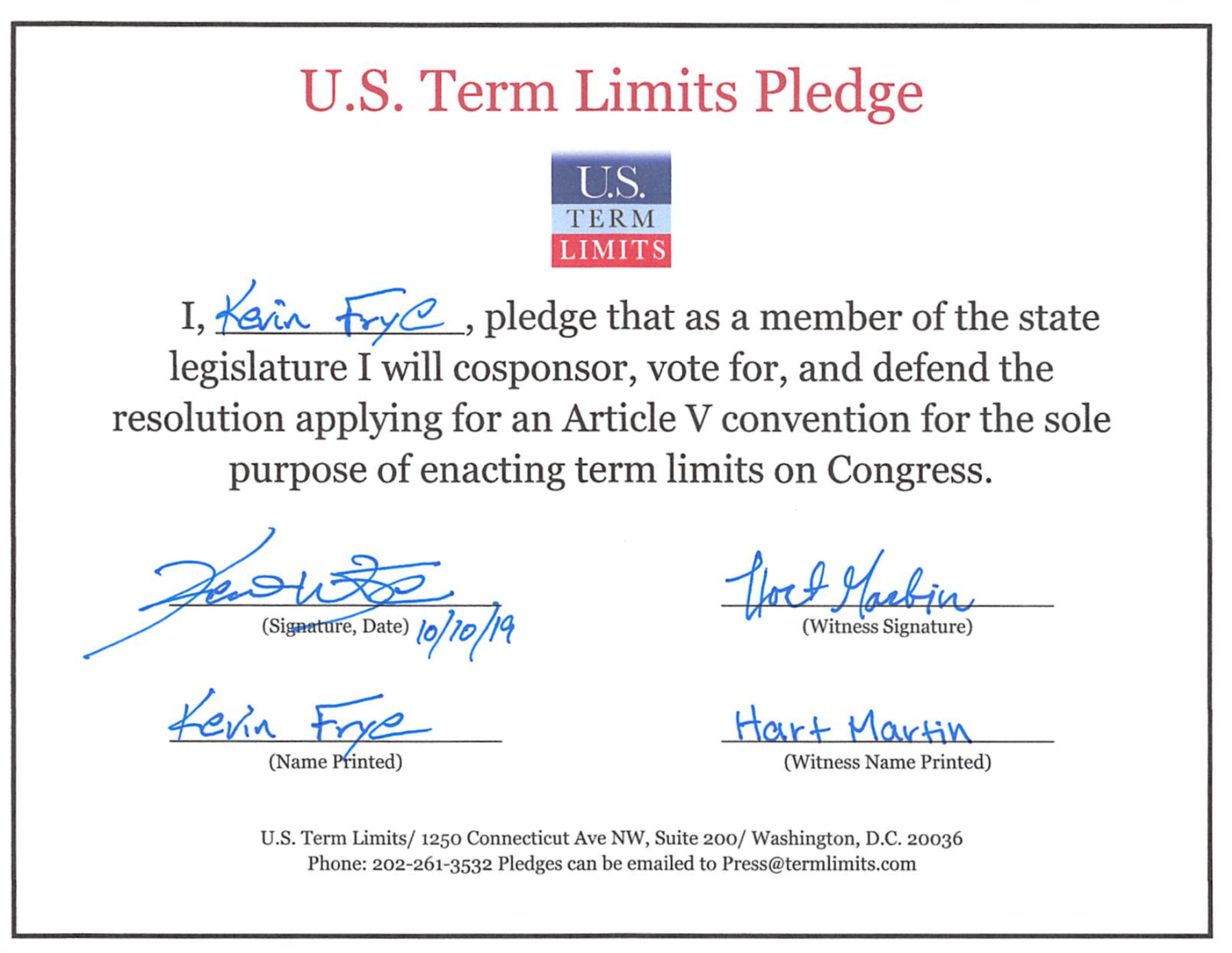 Kevin Frye Pledges To Support Congressional Term Limits
