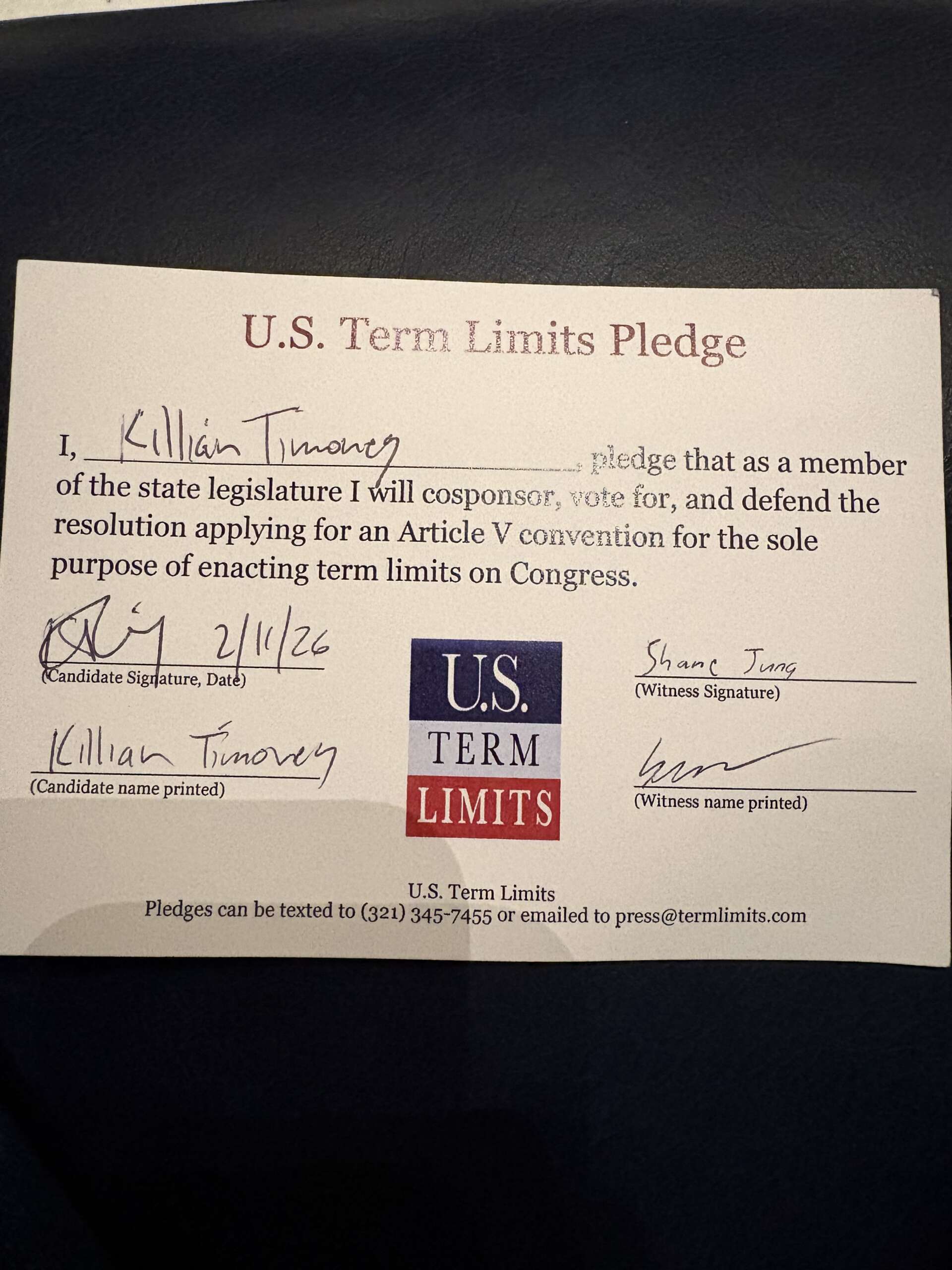 Killian Timoney Pledges to Support Congressional Term Limits