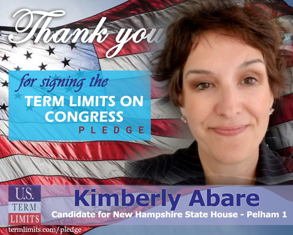 Manchester, NH – U.S. Term Limits (USTL), the leader in the national, non-partisan movement to limit terms for elected officials, is gathering support from state lawmakers across the nation. Its mission is to get 34 states to apply for an amendment proposal convention specific to term limits on Congress. New Hampshire state house candidate, Kimberly Abare (Pelham 1), has committed support for term limits on Congress by signing the U.S. Term Limits pledge. Abare is the first signer in this race.