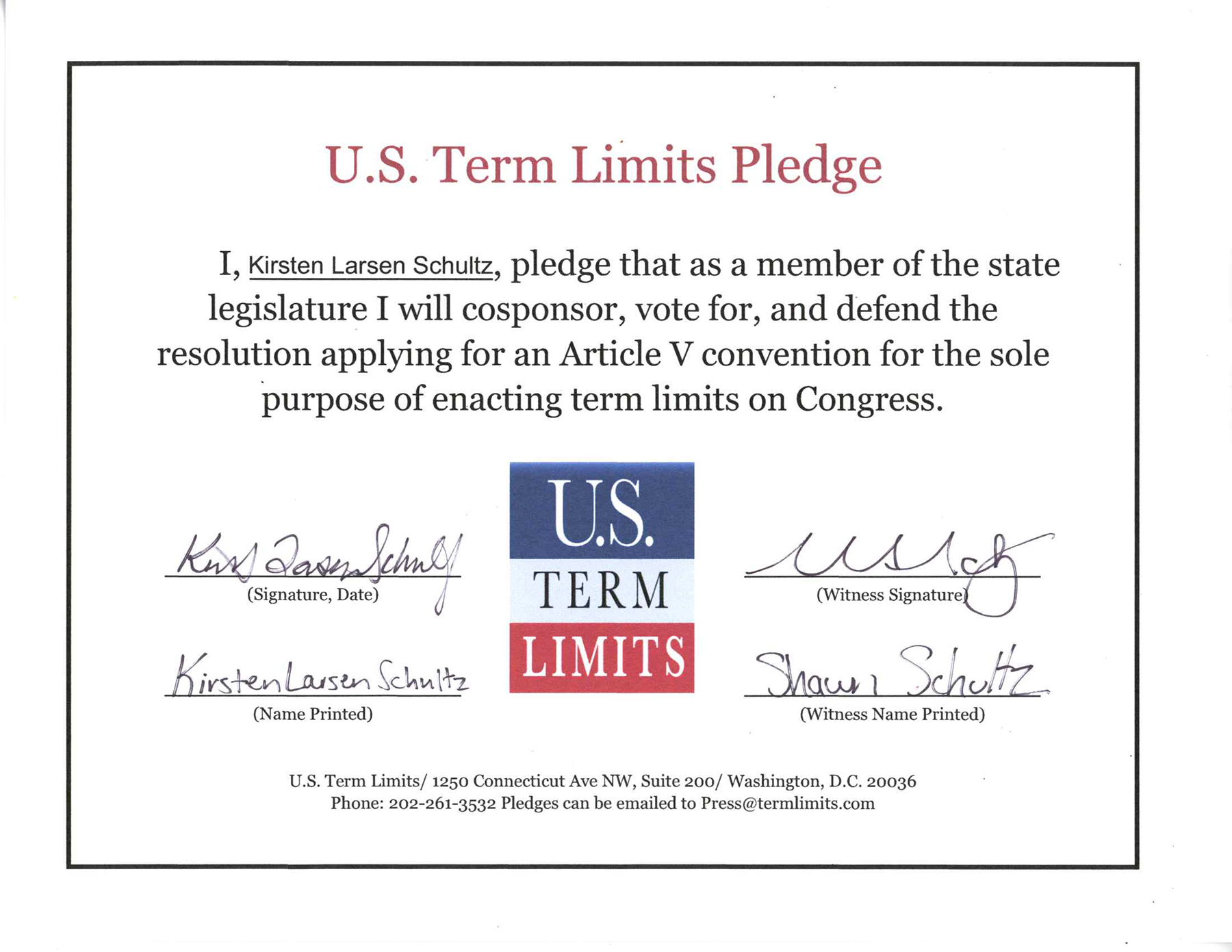 Kirsten Larsen Schultz Pledges to Support Congressional Term Limits