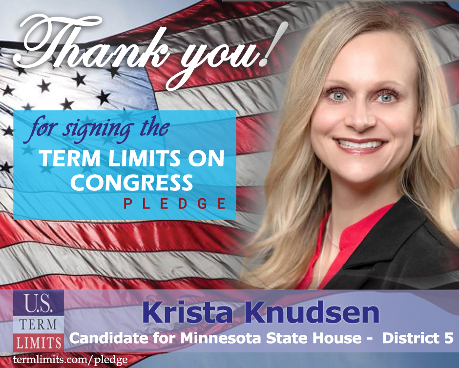 Minneapolis, MN – U.S. Term Limits (USTL), the leader in the national, non-partisan movement to limit terms for elected officials, is gathering support from state lawmakers across the nation. Its mission is to get 34 states to apply for an amendment proposal convention specific to term limits on Congress. Minnesota state house candidate, Krista Knudsen (district 5A) has committed support for term limits on Congress by signing the Term Limits Convention pledge. Knudsen is the first signer in this race.