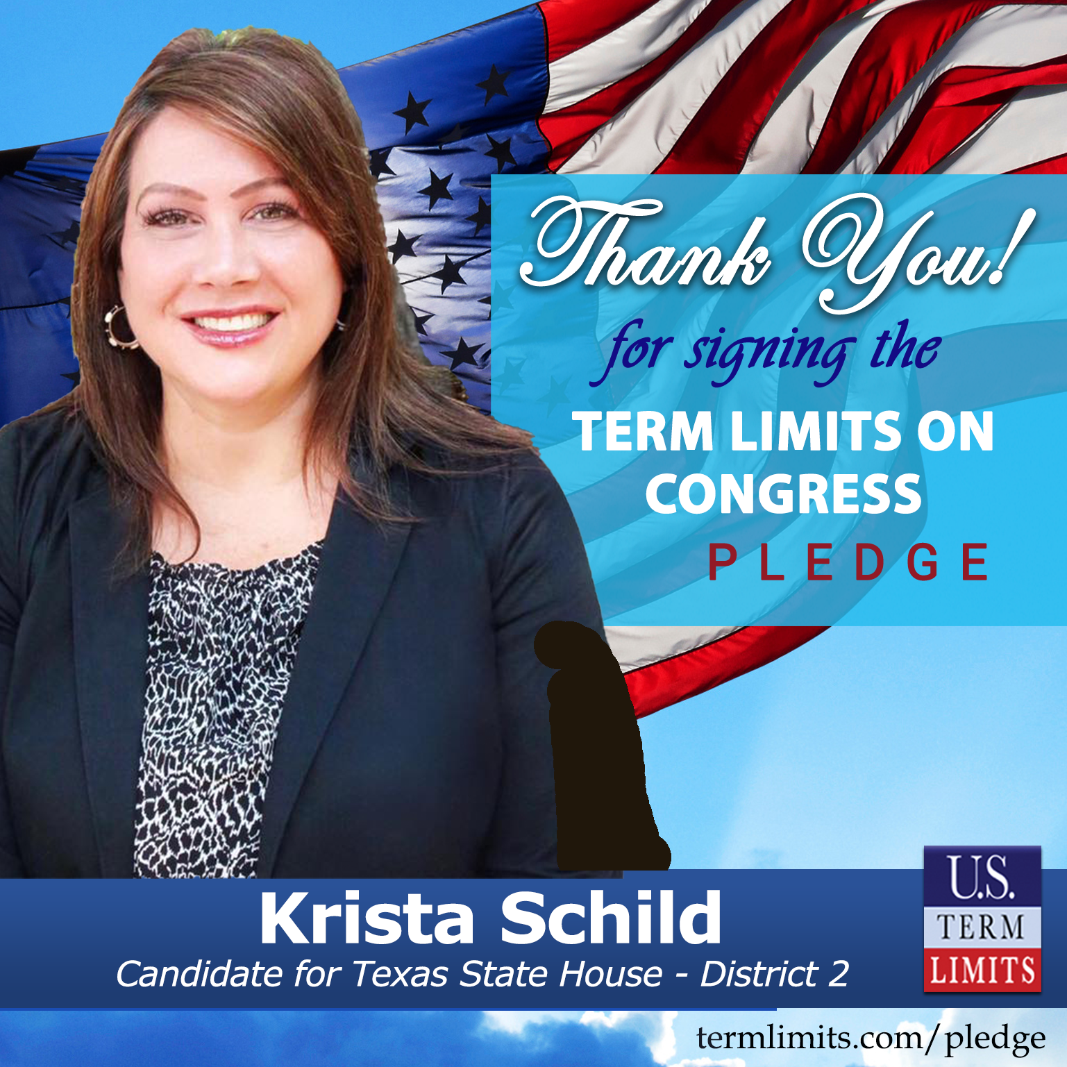 Greenville, TX – U.S. Term Limits (USTL), the leader in the national, non-partisan movement to limit terms for elected officials, is gathering support from state lawmakers across the nation. Its mission is to get 34 states to apply for an amendment proposal convention specific to term limits on Congress. Texas state house candidate, Krista Schild (District 2), has committed support for term limits on Congress by signing the term limits convention pledge. Previously, candidate Heath Hyde also signed the pledge.