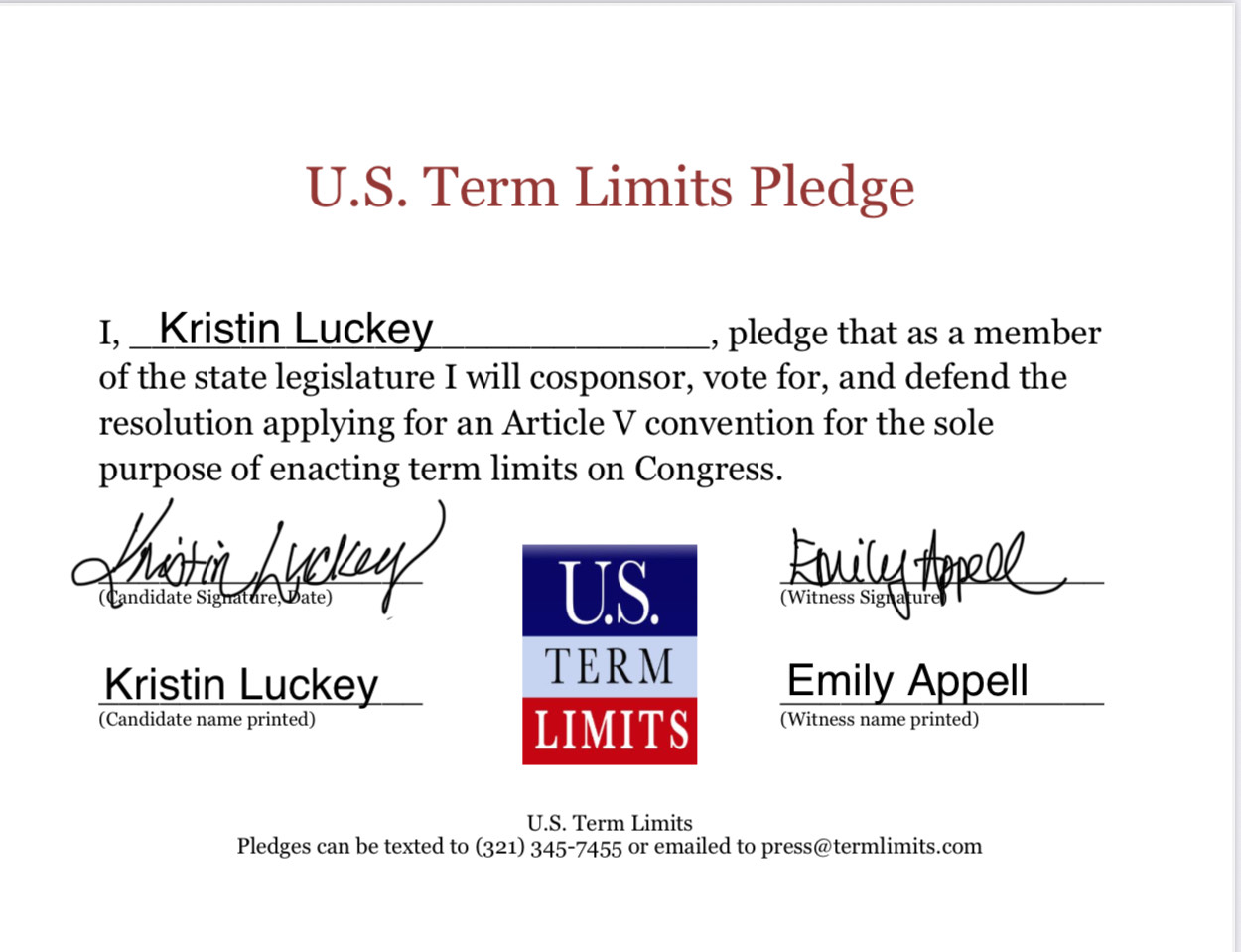 Kristin Luckey Pledges to Support Congressional Term Limits