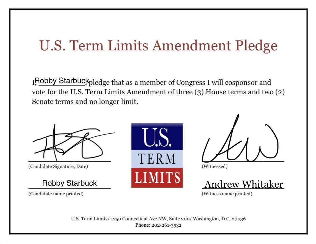 The U.S. Term Limits amendment pledge is provided to every announced candidate for federal office. It reads, “I pledge that as a member of Congress, I will cosponsor and vote for the U.S. Term Limits amendment of three (3) House terms and two (2) Senate terms and no longer limit.” The U.S. Term Limits constitutional amendment has been introduced in both the U.S. Senate by Senator Ted Cruz and his colleagues (SJR3) and the U.S. House by Representative Ralph Norman (HJR12).