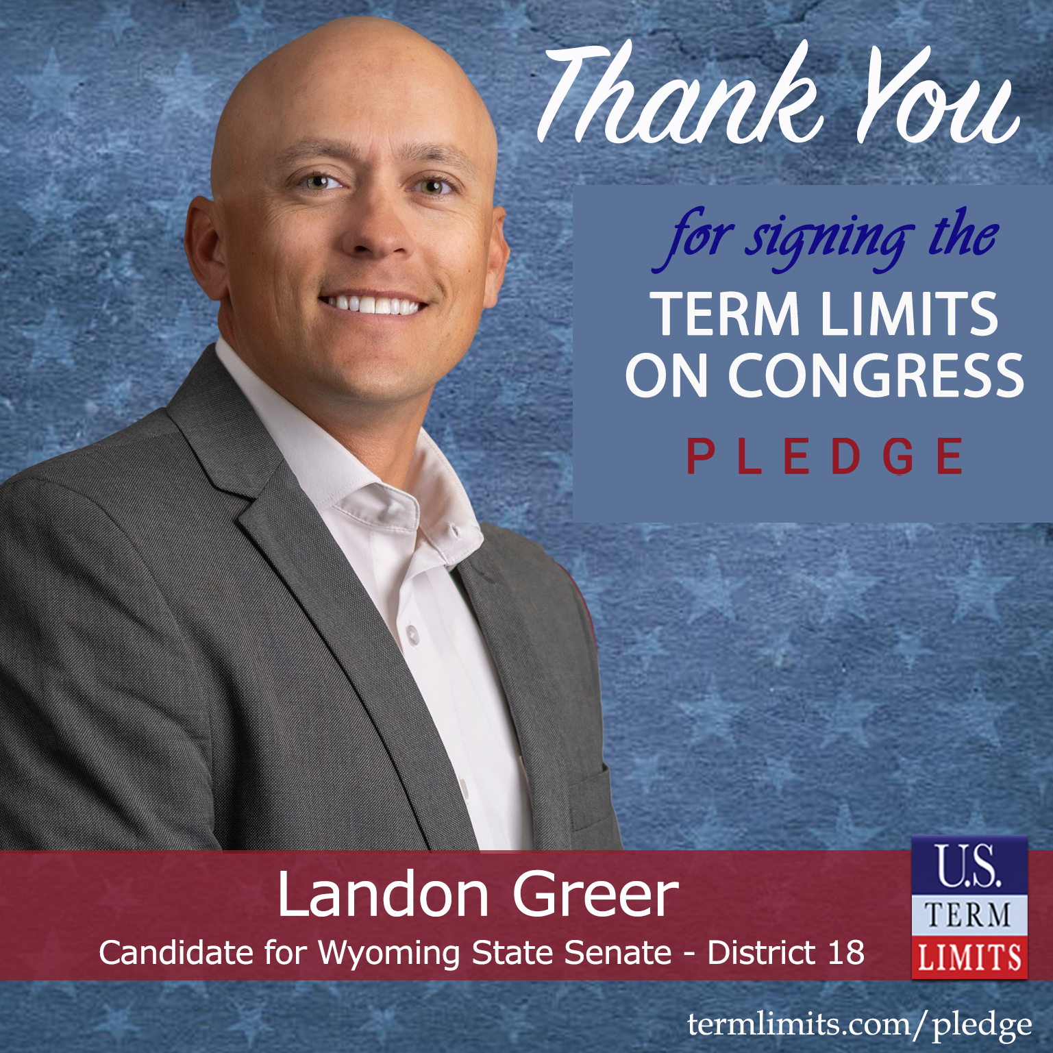Cody, WY – U.S. Term Limits (USTL), the leader in the national, non-partisan movement to limit terms for elected officials, is gathering support from state lawmakers across the nation. Its mission is to get 34 states to apply for an amendment proposal convention specific to term limits on Congress. Wyoming state senate candidate, Landon Greer (district 18), has committed support for term limits on Congress by signing the term limits convention pledge.