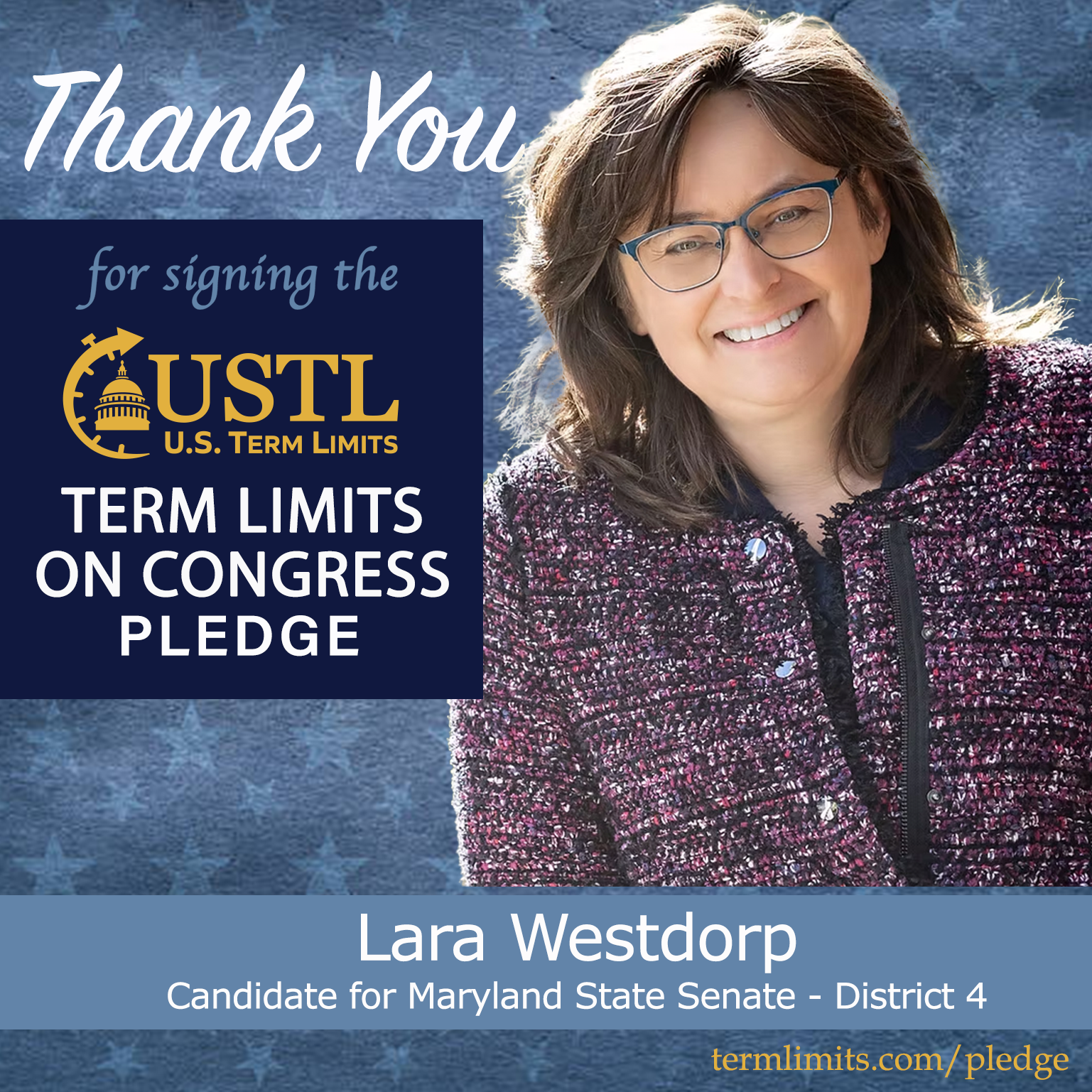 Libertytown, MD – U.S. Term Limits (USTL), the leader in the national, non-partisan movement to limit terms for elected officials, is gathering support from state lawmakers across the nation. Its mission is to get 34 states to apply for an amendment proposal convention specific to term limits on Congress. Maryland state senate candidate, Lara Westdorp (district 4), has committed support for term limits on Congress by signing the term limits convention pledge.