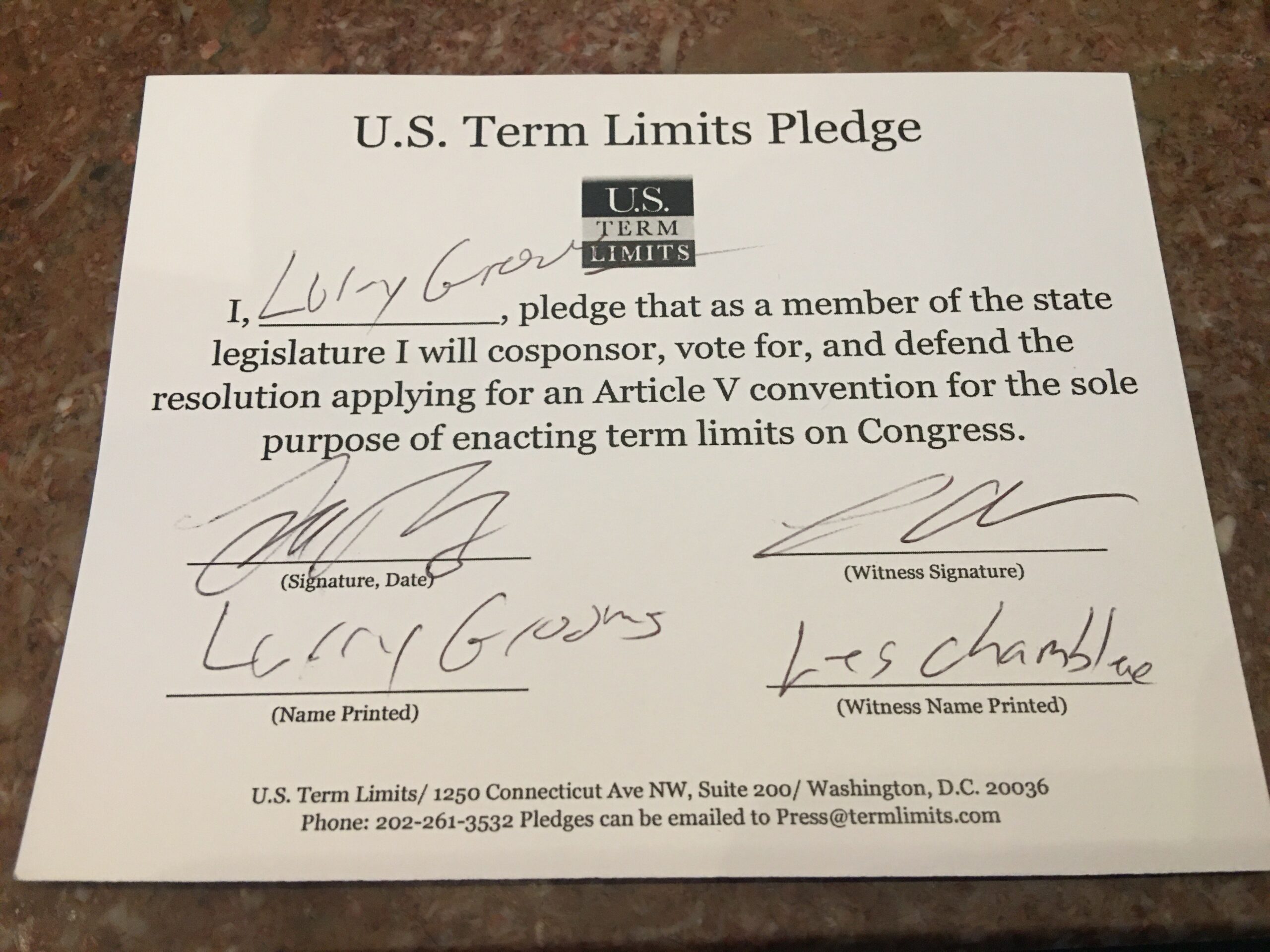 USTL President, Philip Blumel, commented on Grooms’s pledge saying, “Larry’s support of term limits shows that there are individuals who are willing to listen to the majority of voters who want term limits. America needs a Congress that will be served by citizen legislators, not career politicians.”