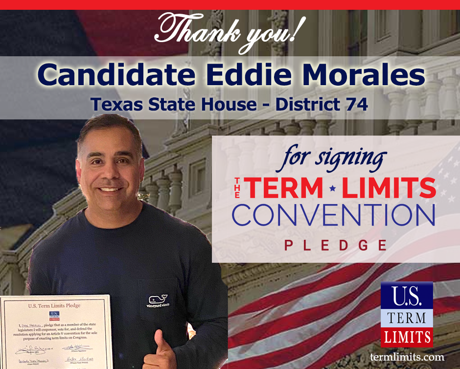 The U.S. Term Limits pledge is provided to candidates and members of state legislatures. It reads, “I pledge that, as a member of the state legislature, I will cosponsor, vote for, and defend the resolution applying for an Article V convention for the limited purpose of enacting term limits on Congress.”