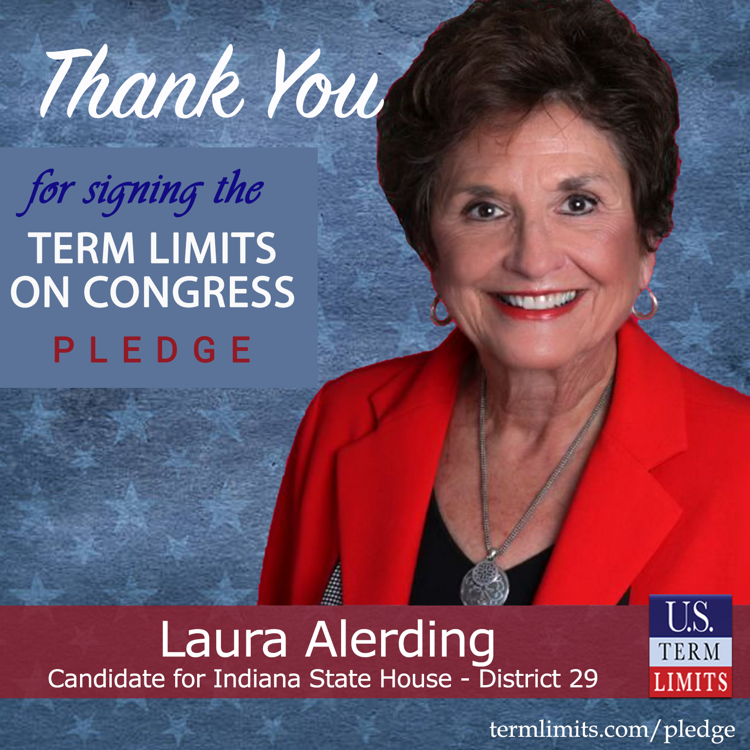 Noblesville, IN – U.S. Term Limits (USTL), the leader in the national, non-partisan movement to limit terms for elected officials, is gathering support from state lawmakers across the nation. Its mission is to get 34 states to apply for an amendment proposal convention specific to term limits on Congress. Indiana state house candidate, Laura Alerding (District 29), has committed support for term limits on Congress by signing the term limits convention pledge. Alerding is the first signer in this race.