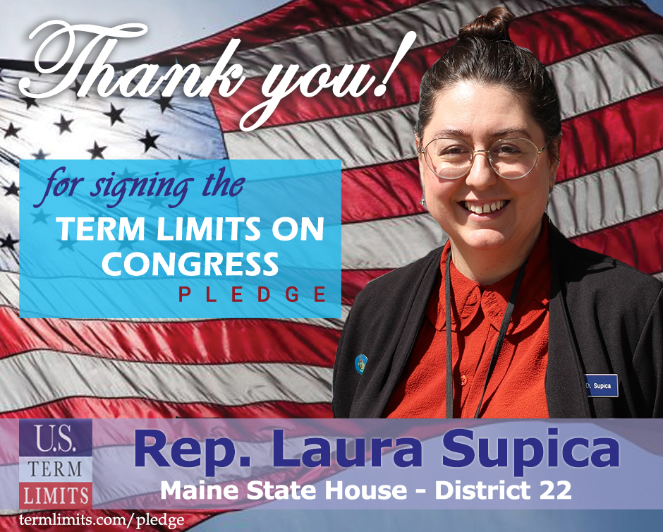 Bangor, ME – U.S. Term Limits (USTL), the leader in the national, non-partisan movement to limit terms for elected officials, is gathering support from state lawmakers across the nation. Its mission is to get 34 states to apply for an amendment proposal convention specific to term limits on Congress. Maine state Rep. Laura Supica,  (district 22), has committed support for term limits on Congress by signing the Term Limits Convention pledge.