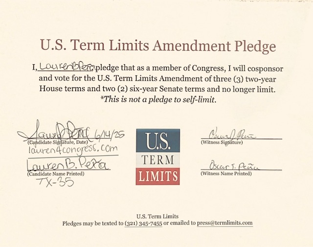 Washington D.C. – U.S. Term Limits (USTL), the leader in the non-partisan national movement to limit terms for elected officials, praises 2026 U.S. Representative candidate for Texas, Lauren Peña (district 35), for signing the pledge for an amendment to term limit Congress. Peña is the first signer in this race.