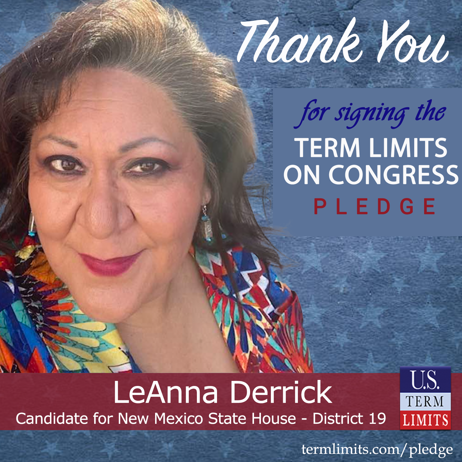 Albuquerque, NM – U.S. Term Limits (USTL), the leader in the national, non-partisan movement to limit terms for elected officials, is gathering support from state lawmakers across the nation. Its mission is to get 34 states to apply for an amendment proposal convention specific to term limits on Congress. New Mexico state house candidate, LeAnn Derrick (District 19), has committed support for term limits on Congress by signing the Term Limits Convention Pledge. Derrick is the first signer in this race.