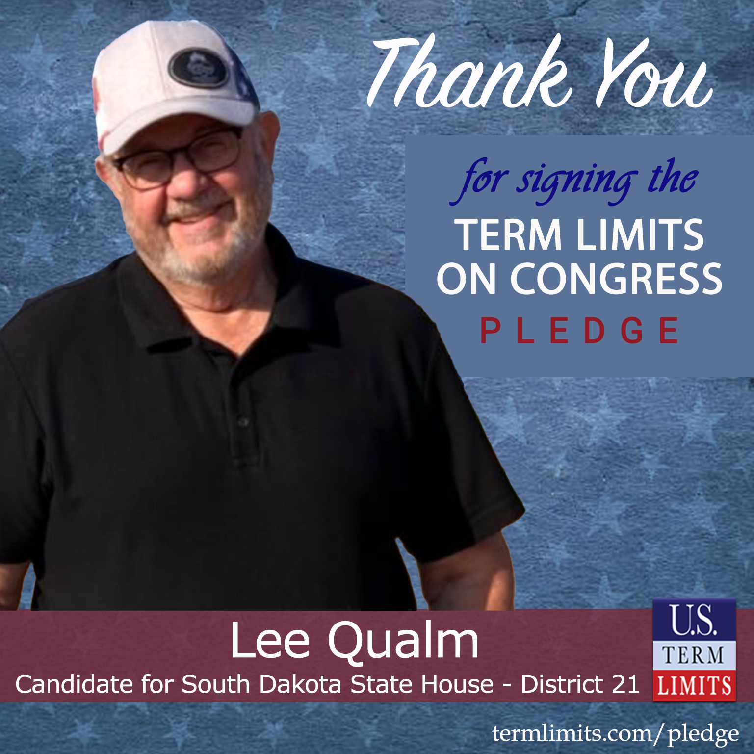Burke, SD – U.S. Term Limits (USTL), the leader in the national, non-partisan movement to limit terms for elected officials, is gathering support from state lawmakers across the nation. Its mission is to get 34 states to apply for an amendment proposal convention specific to term limits on Congress. South Dakota state house candidate, Lee Qualm (District 21), has committed support for term limits on Congress by signing the Term Limits Convention Pledge.