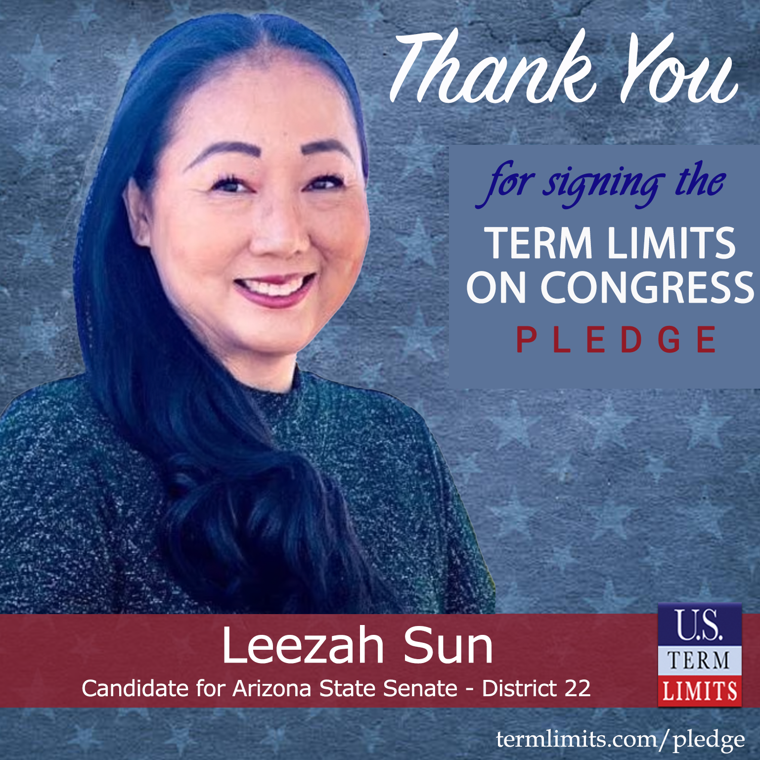 USTL President, Philip Blumel, commented on Sun’s pledge saying, “Leezah’s strong support of term limits shows that there are individuals who are willing to listen to the majority of voters who want term limits. America needs a Congress that will be served by citizen legislators, not career politicians.”