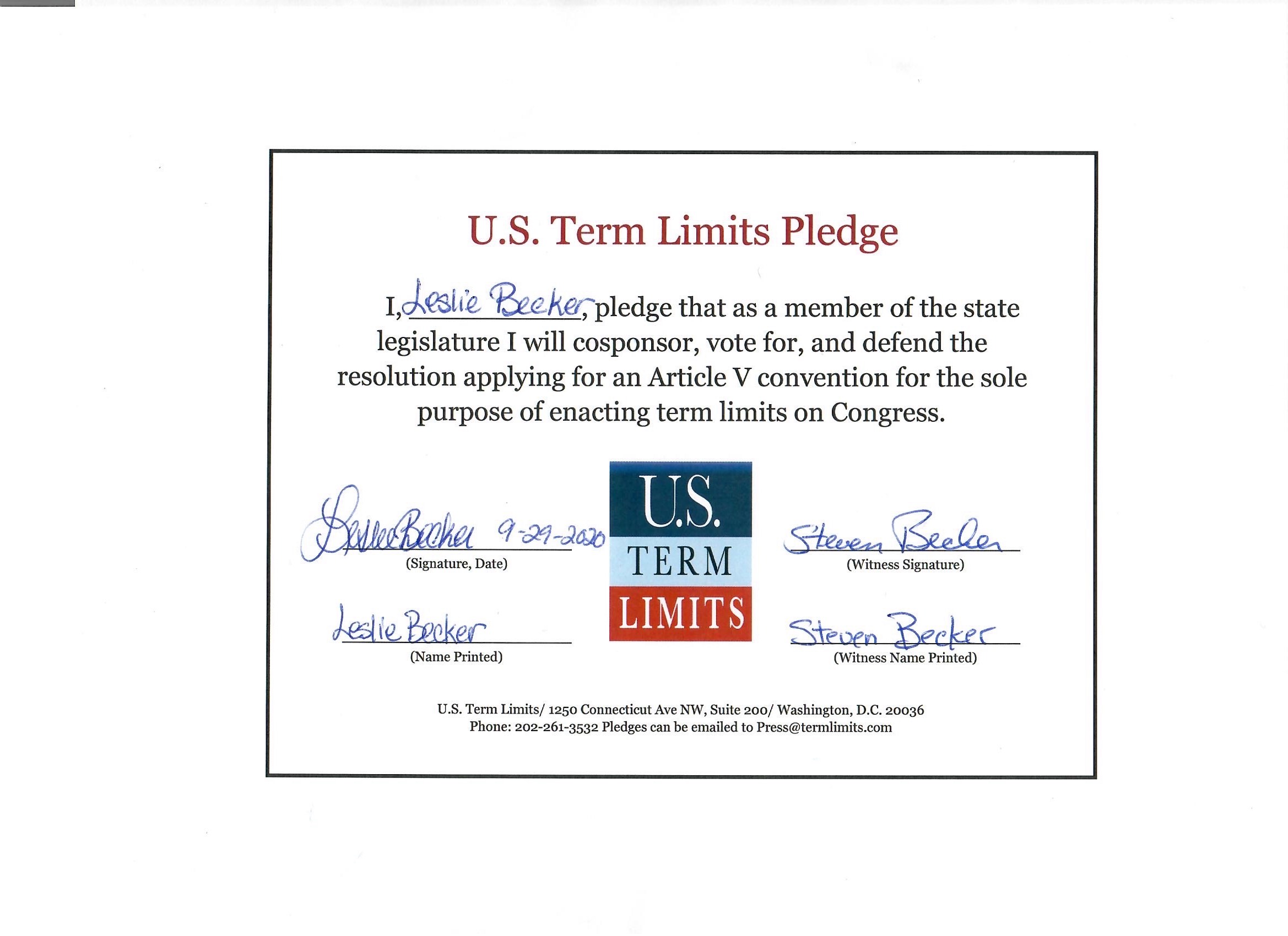 Leslie Becker Pledges to Support Congressional Term Limits